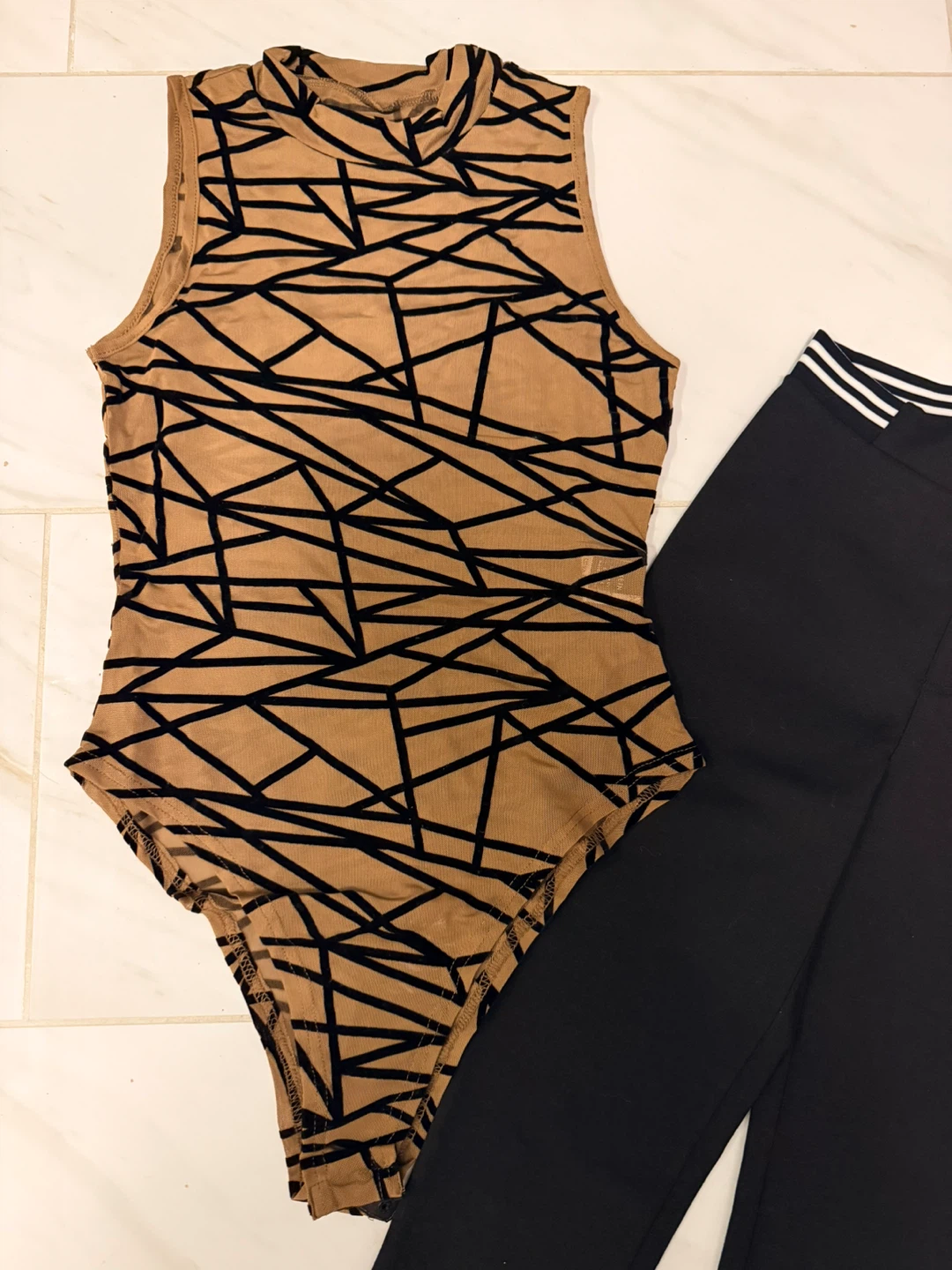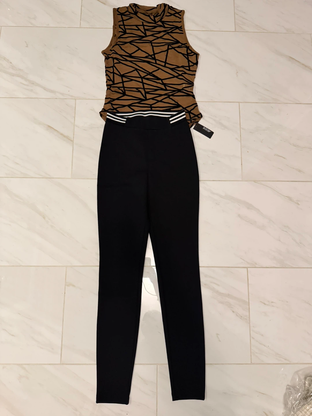 This set of two clothing pieces are new and includes a tan abstract print sleeveless turtleneck tank bodysuit and black leggings. The leggings have a white striped waistband black ponte