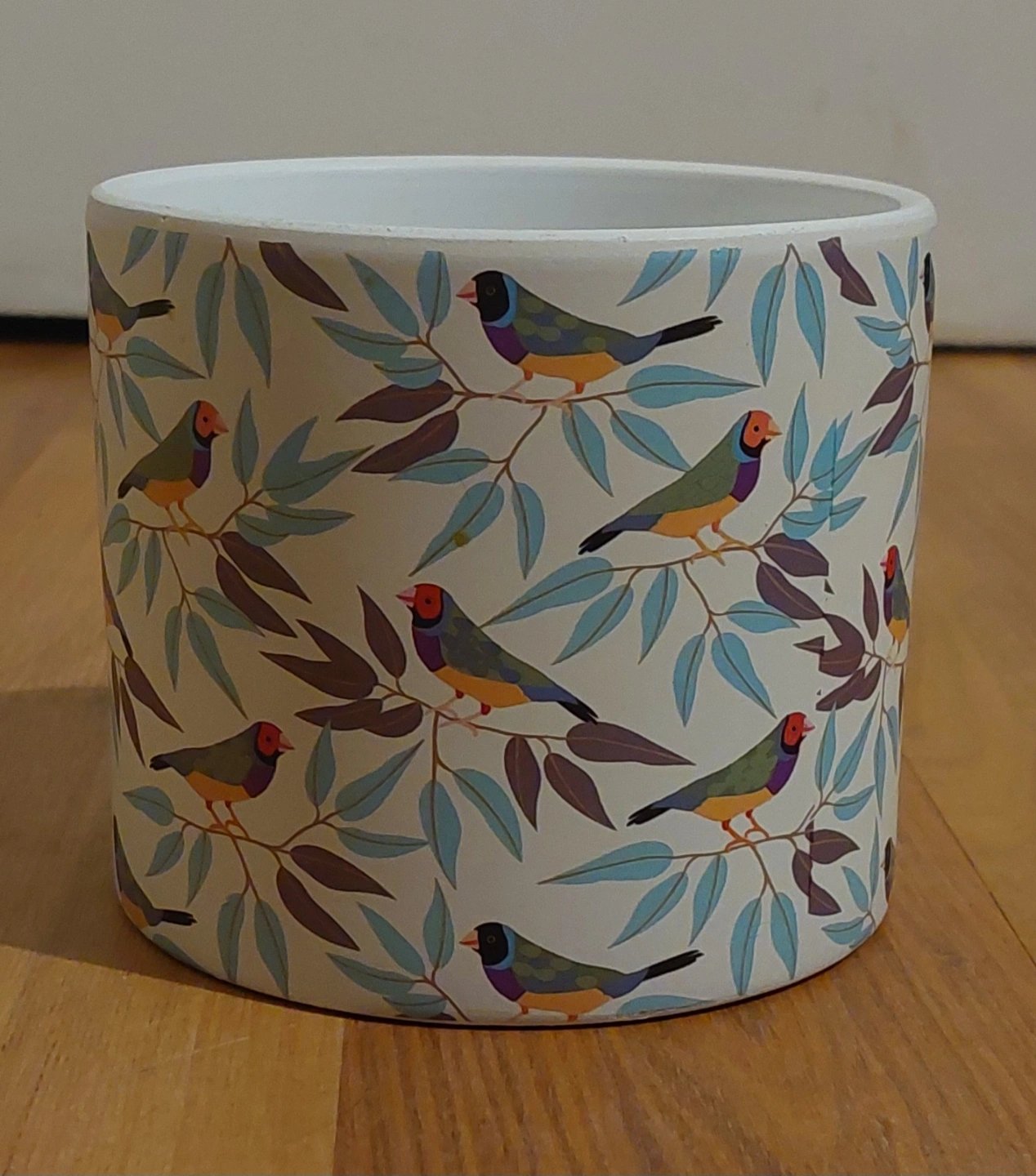 Small ceramic planter. Features a colourful bird and leaf pattern. Perfect for small succulents or other plants.