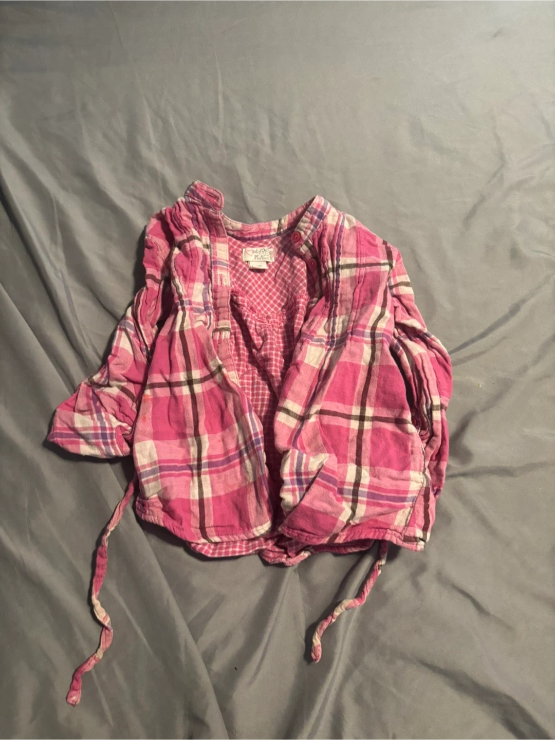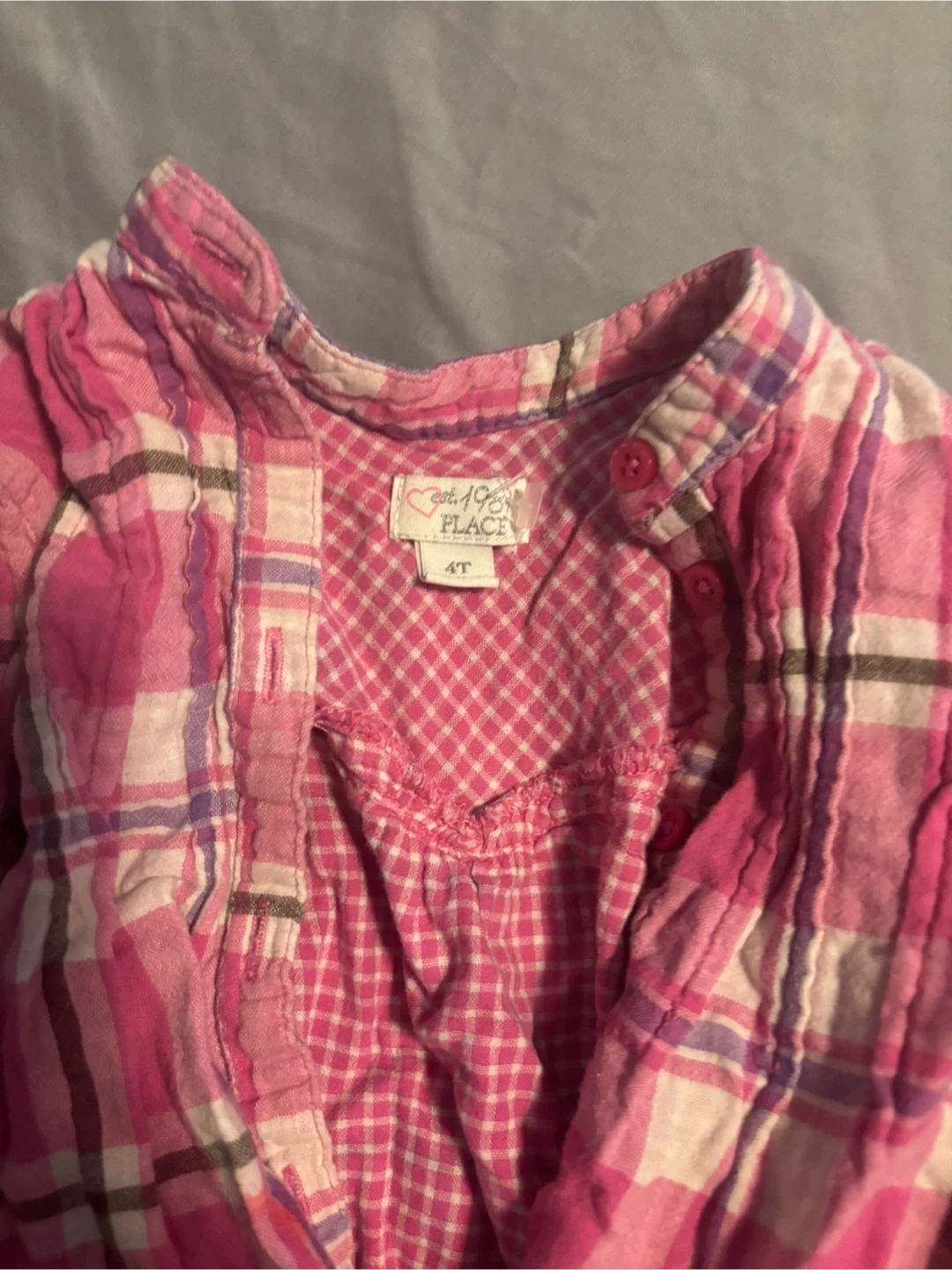 A pink plaid long-sleeve shirt from The Children's Place. It's a size 4T. This shirt has buttons at the neckline and ties at the waist.