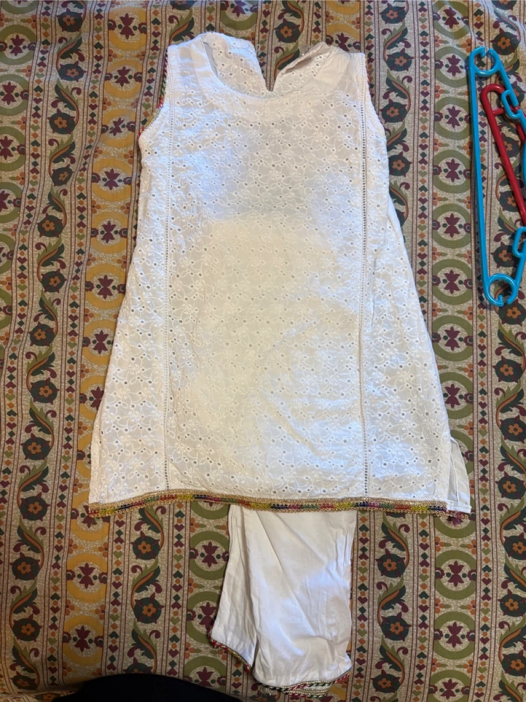 This white sleeveless kurti features intricate embroidery and a colourful trim. It comes with matching white pants. Cotton material.