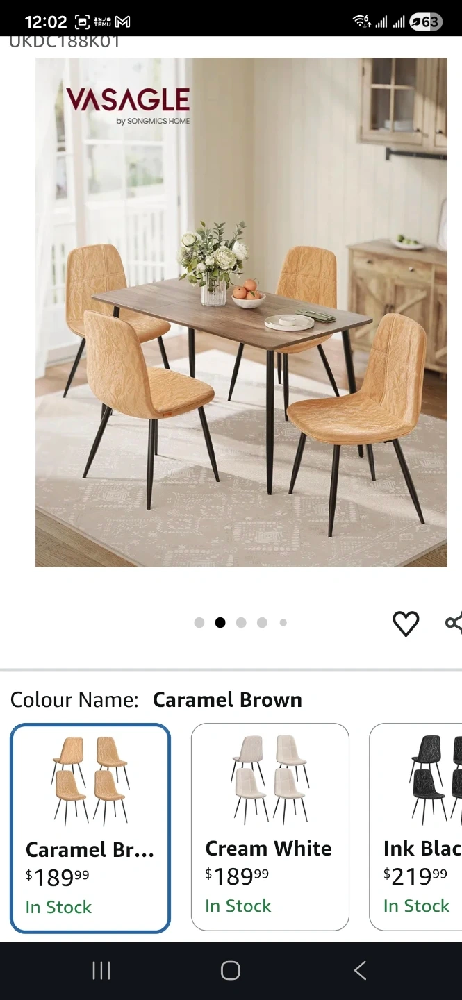 Set of four VASAGLE dining chairs in Caramel Brown. Upholstered with a faux leather finish and a black metal frame. Easy to clean and comfortable seating.