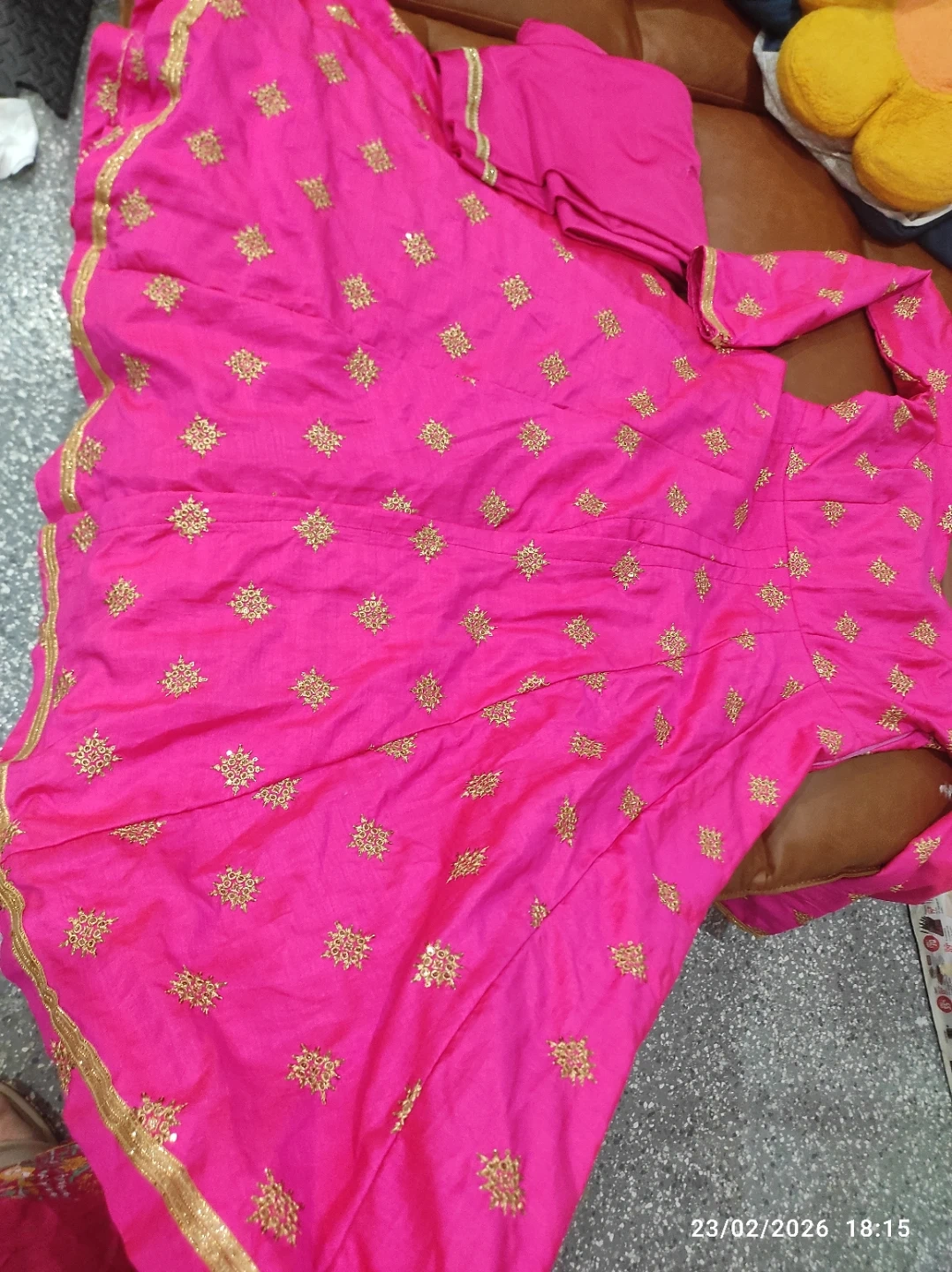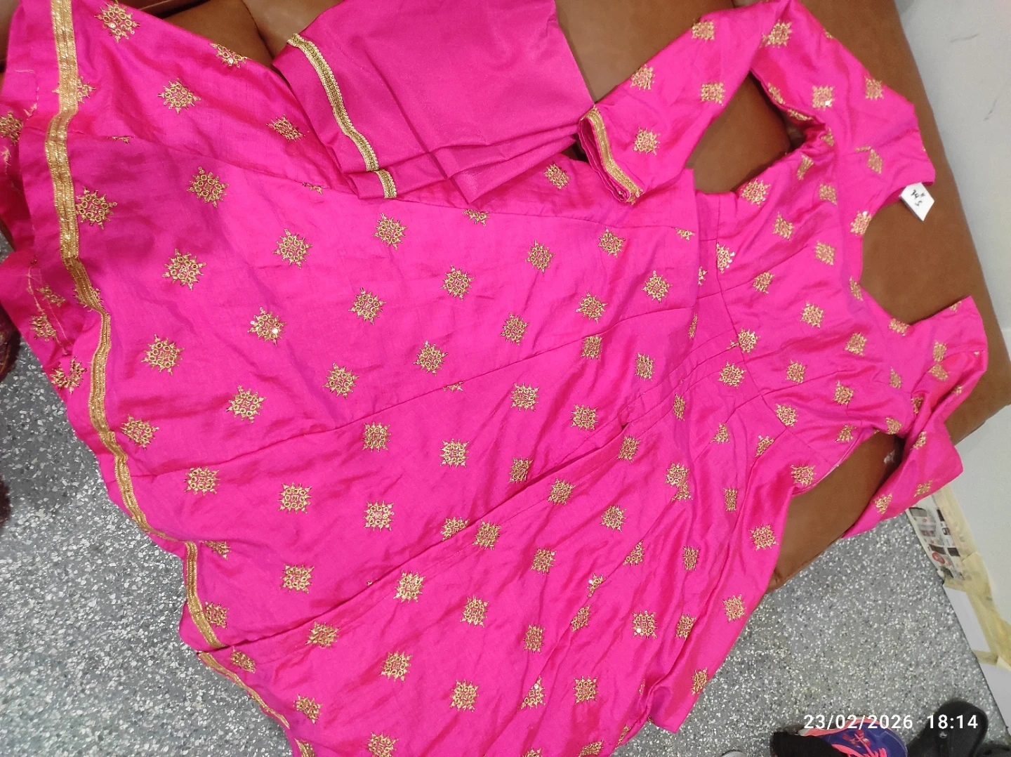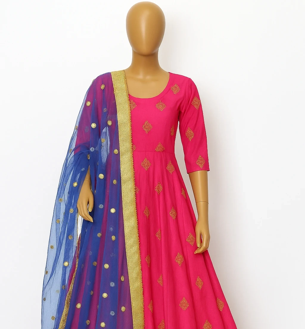 Pink Anarkali suit with gold embroidery. It comes with a sheer blue dupatta with gold embellishments. The suit's fabric appears to be silk-blend, and the dupatta is net material. Perfect for festive occasions!