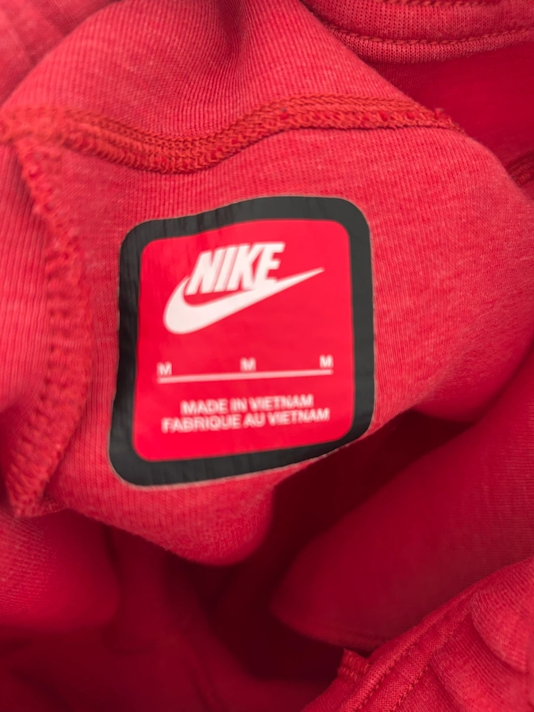 These are Nike Tech Fleece joggers in red. They're a size medium for kids and are made from a soft, comfortable fabric. Features a zippered pocket on the left leg.