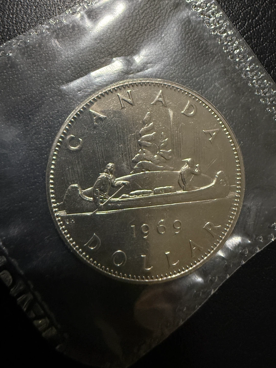 Selling a 1969 Canadian dollar coin. It features Queen Elizabeth II on one side and a canoe scene on the other. A great piece for collectors!