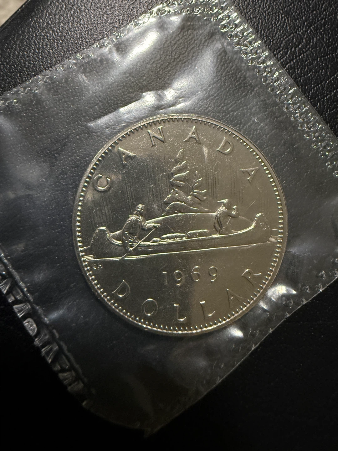 Selling a 1969 Canadian dollar coin. It features Queen Elizabeth II on one side and a canoe scene on the other. A great piece for collectors!
