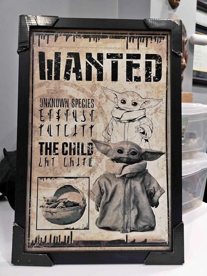 This is a fun wanted poster featuring the popular character, Baby Yoda (Grogu). It's a great piece for any Star Wars fan's collection. Let me know if you're interested!