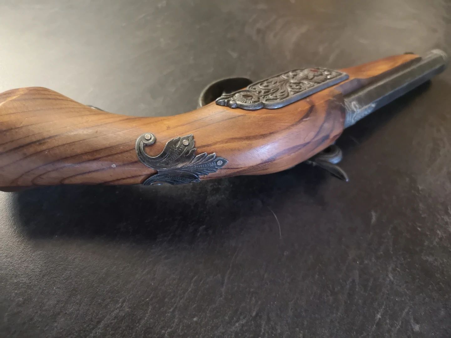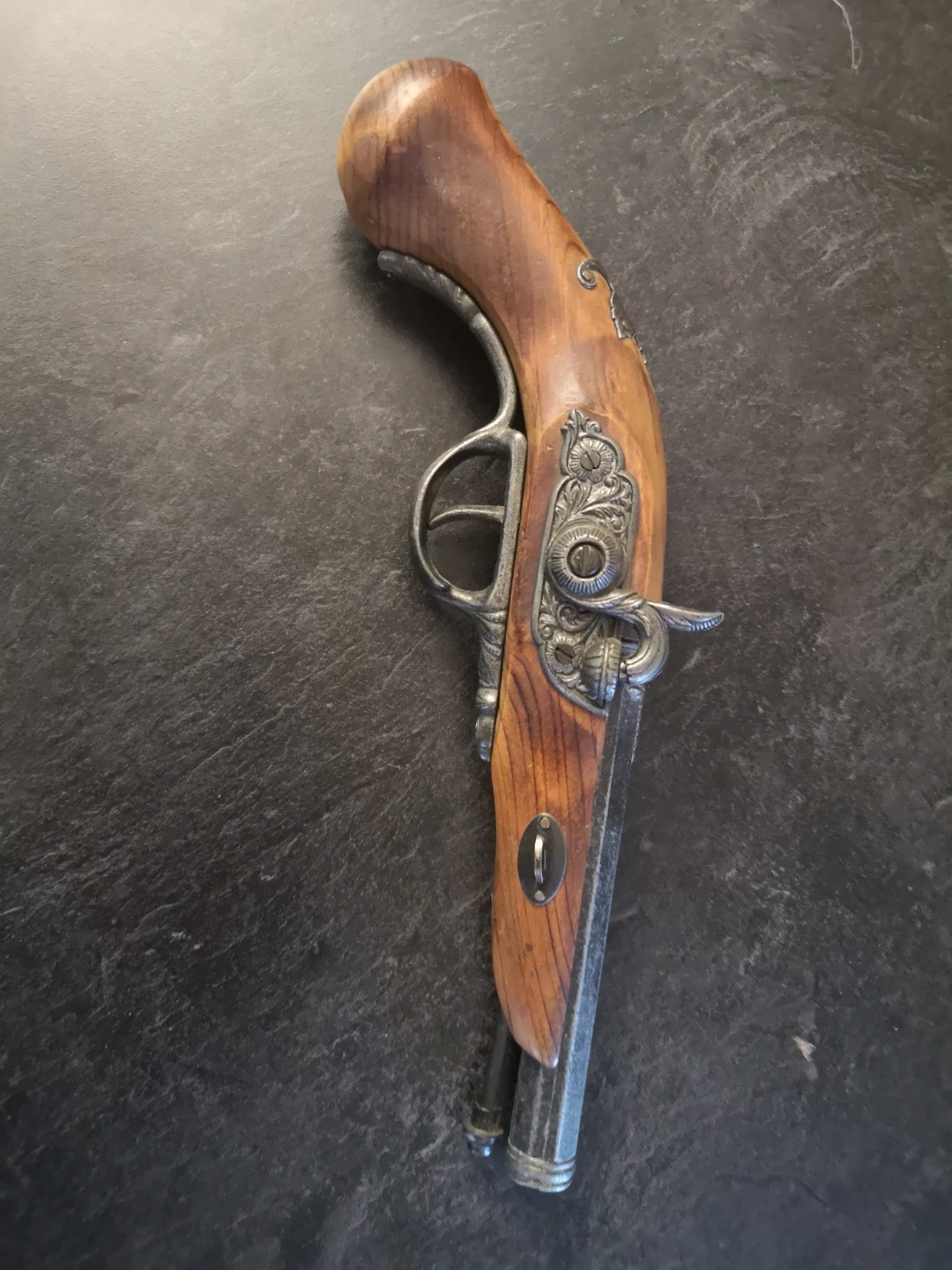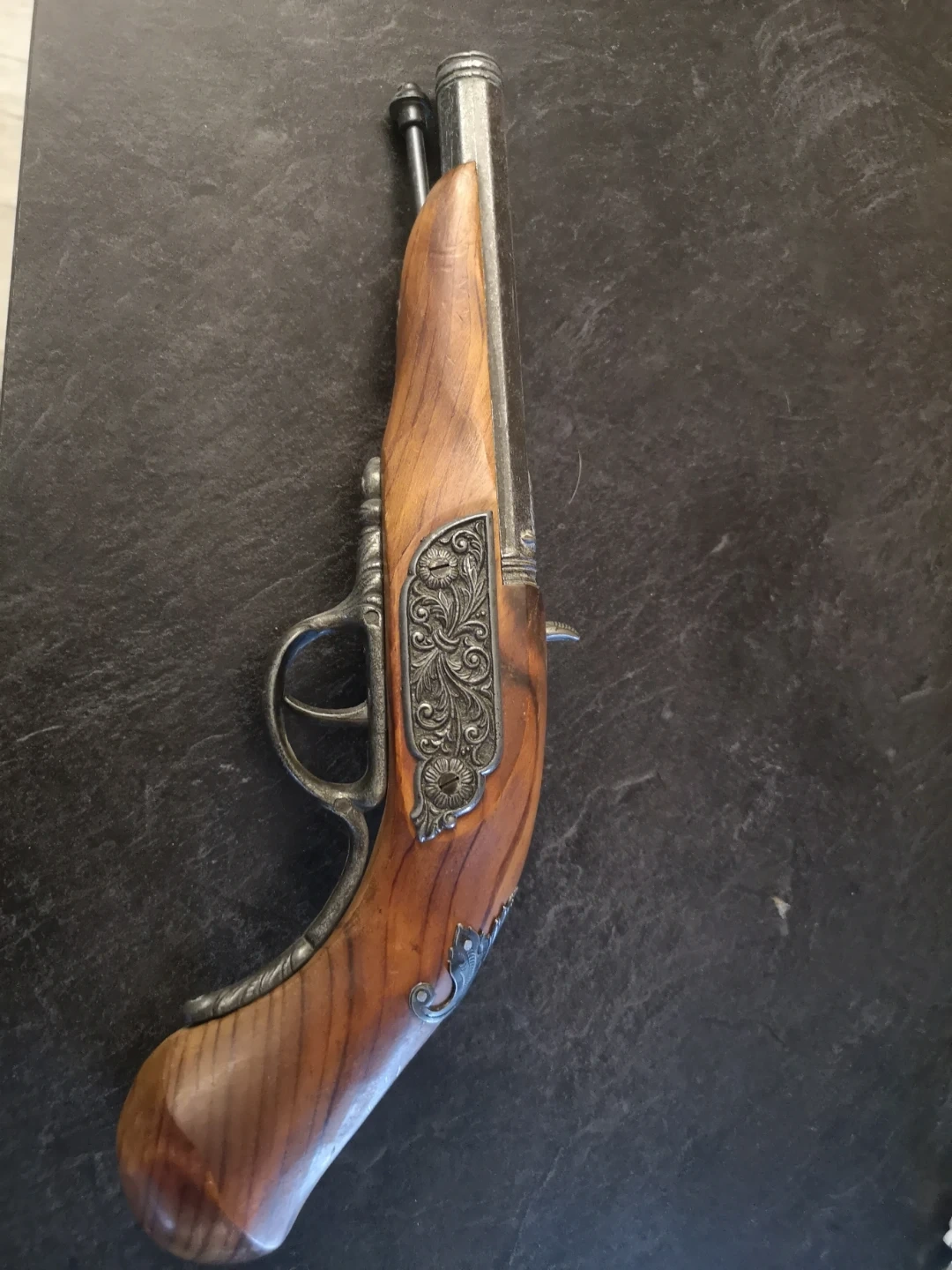 This is a decorative pistol with a wooden handle and metal accents. It features ornate detailing on the metalwork. A unique display piece for collectors.