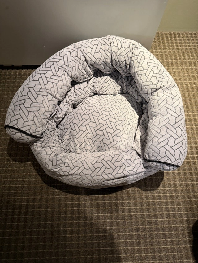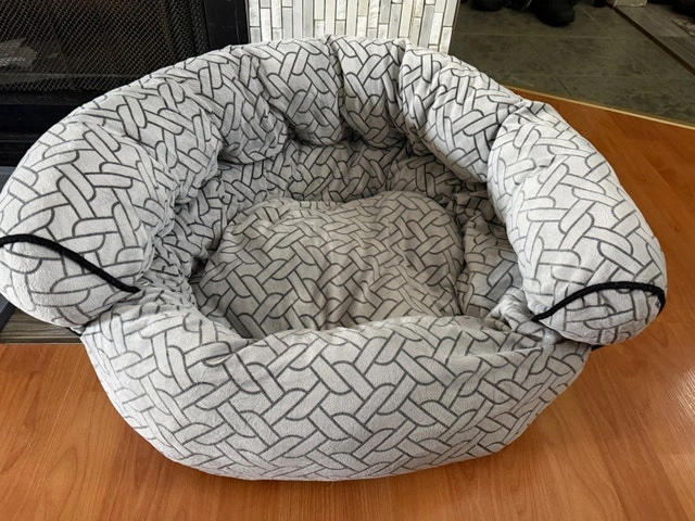 Used but in excellent condition, pet bed. It's washable and has zippers so you can pull out all the stuffing. I first bought it for 2 cats, which they fit into, and then my dog used it, who is medium sized. She now likes to stretch out, not curl up in a ball as much, so I hope another pet can enjoy it. It's in a soft, velvety fabric with a chain link pattern. The inside bed area is roughly 12" x 16" but easily stretches out wider. Overall, about 23" x 26" or so. Pickup in Woodbine, cash only, please.