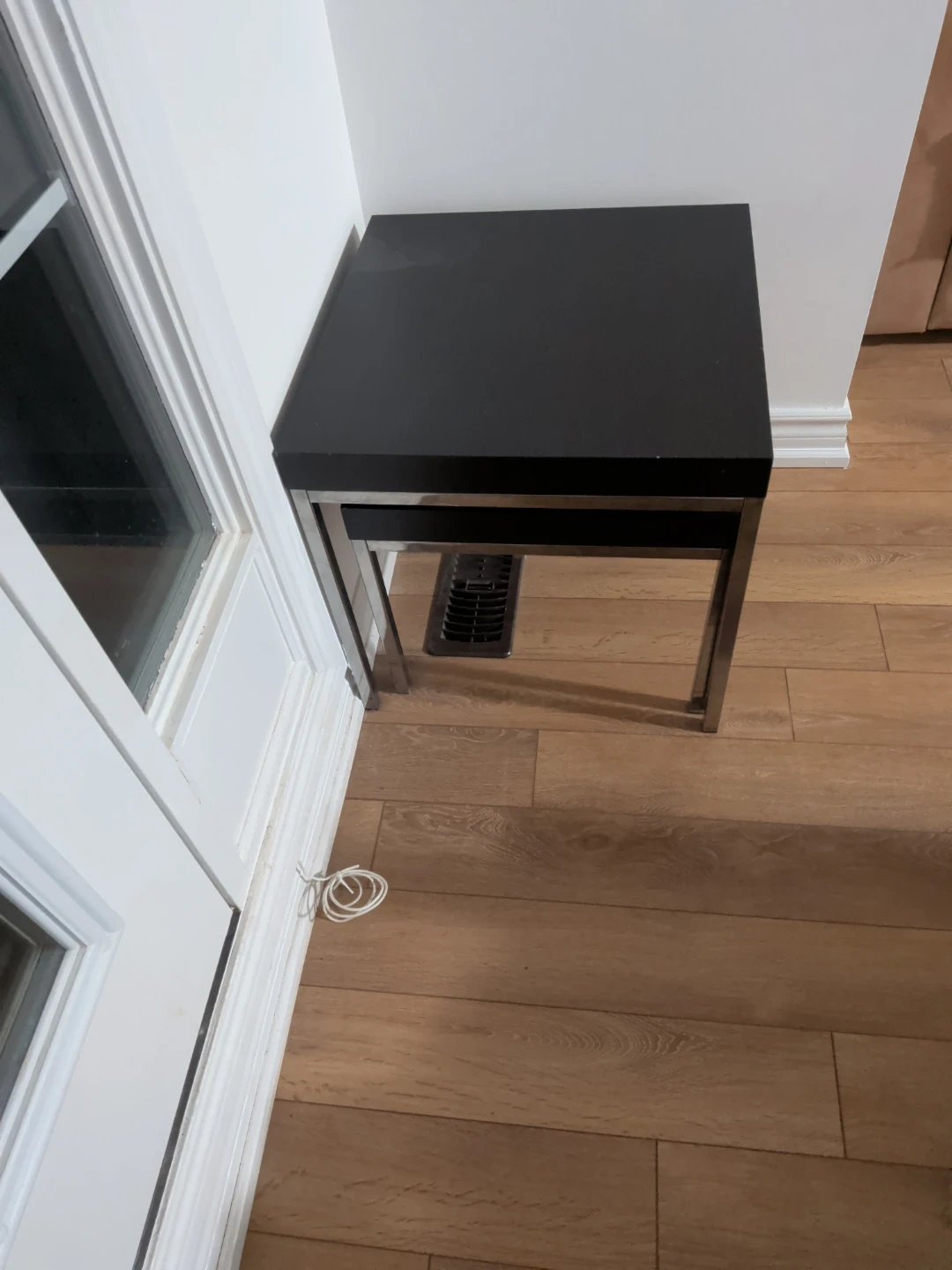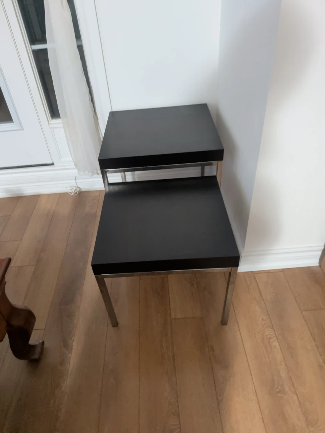 These nesting side tables feature a sleek black finish with chrome-look metal legs. They offer versatile placement options, fitting neatly under each other or used separately. Perfect for small spaces or adding extra surface area to your living room. The height is 18 and 15 inches.