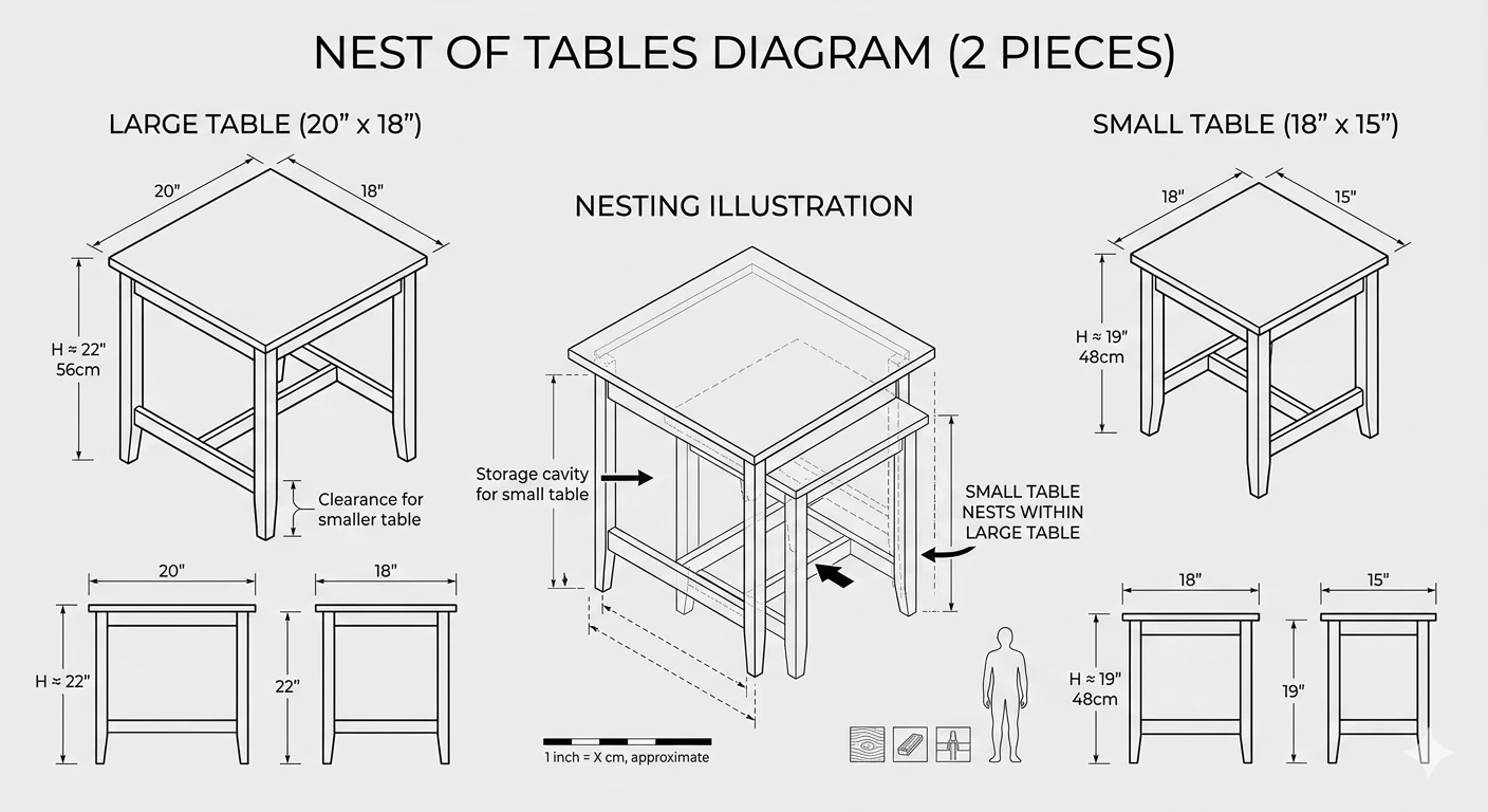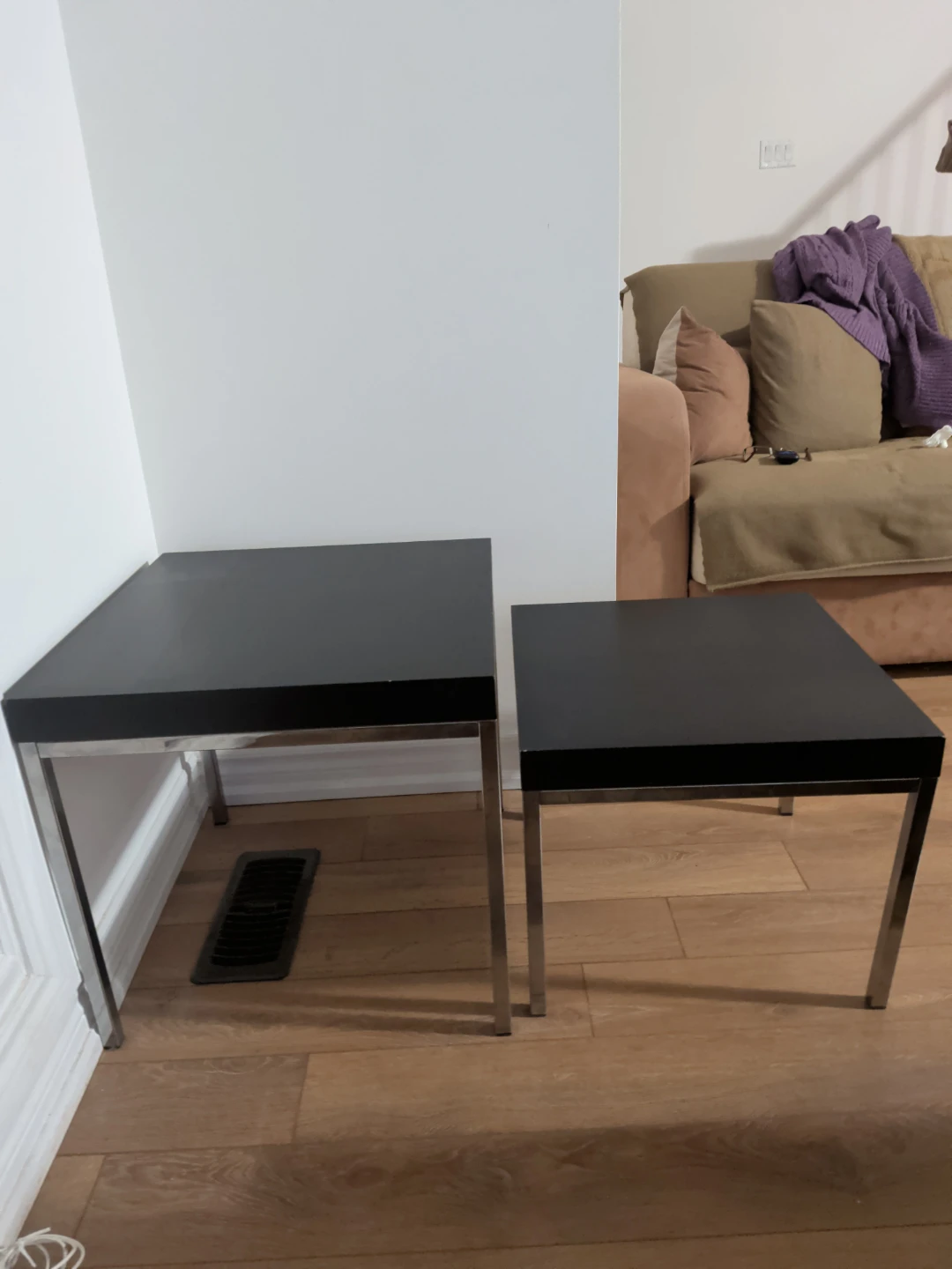 These nesting side tables feature a sleek black finish with chrome-look metal legs. They offer versatile placement options, fitting neatly under each other or used separately. Perfect for small spaces or adding extra surface area to your living room. The height is 18 and 15 inches.