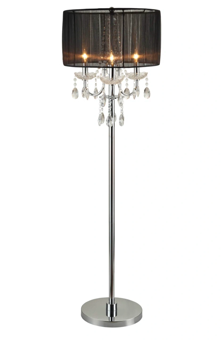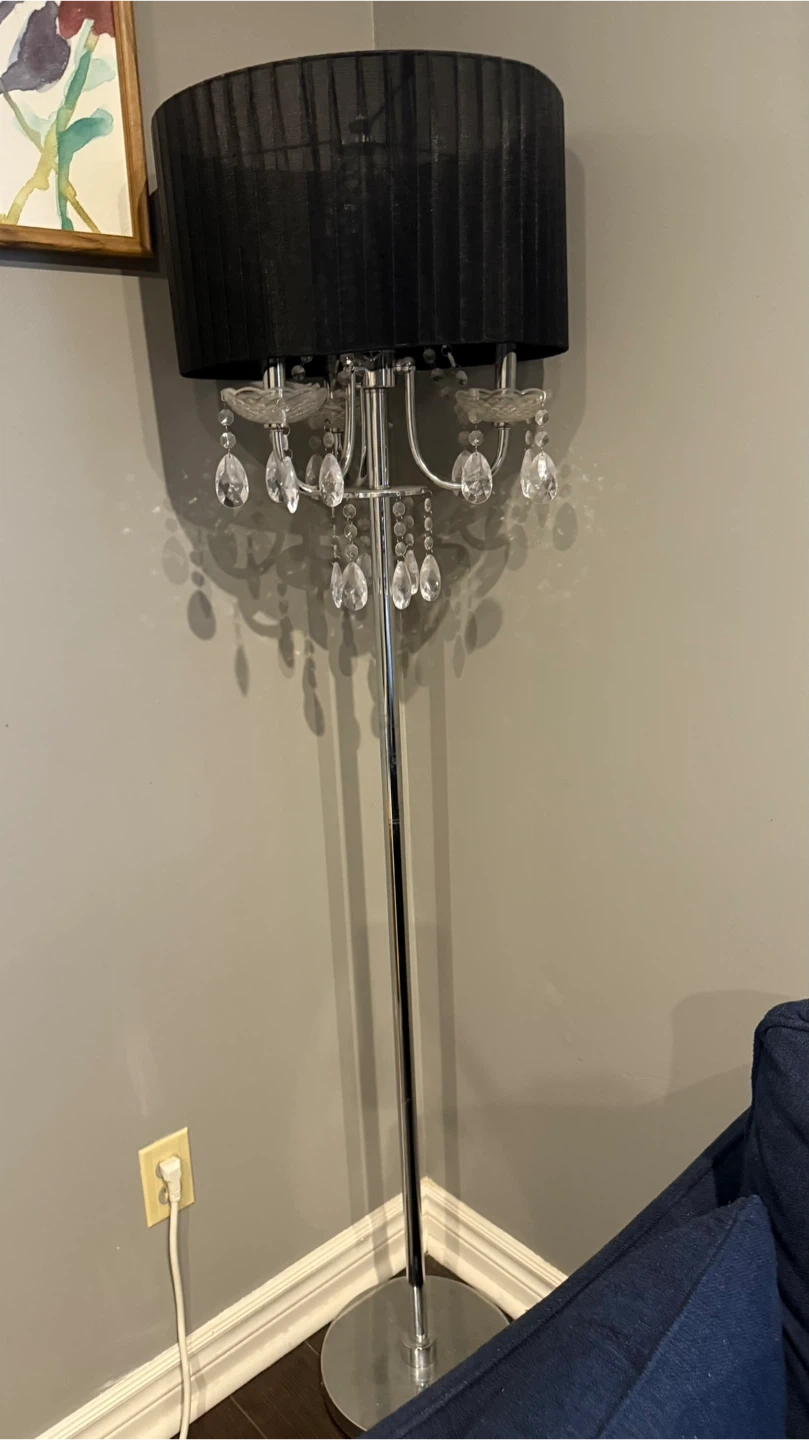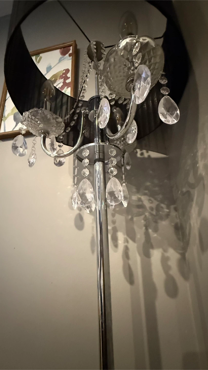 Selling a chandelier-style floor lamp with a black shade and crystal accents. It's in good condition and would add a touch of elegance to any room!