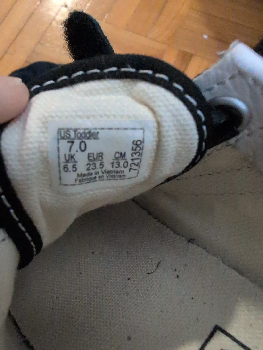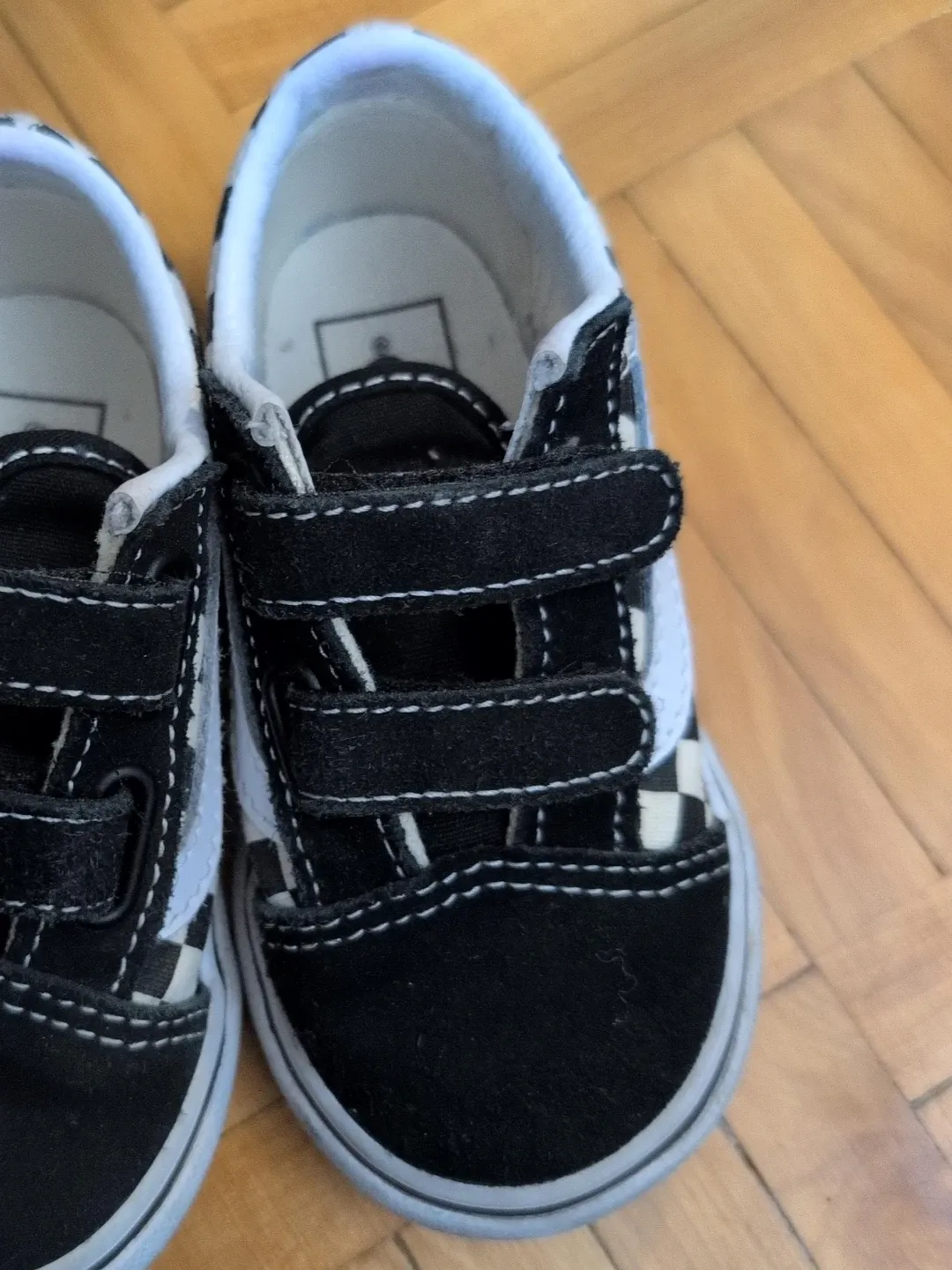 Toddler Vans Old Skool V Crib shoes in a black and white checkerboard pattern. Made in Vietnam. US Toddler size 7. Features velcro straps for easy on and off.