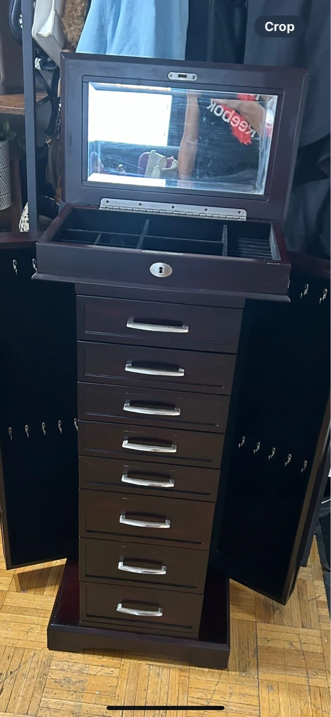 This Mele & Co. Olympia jewellery armoire features a dark walnut finish. It has eight drawers for storage and a mirrored top compartment with organizers. The sides of the armoire include earring racks.