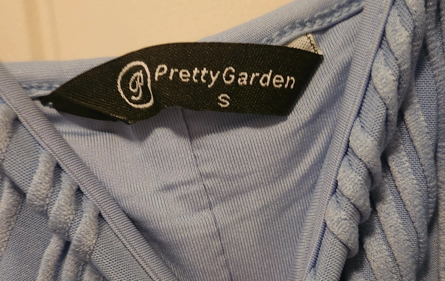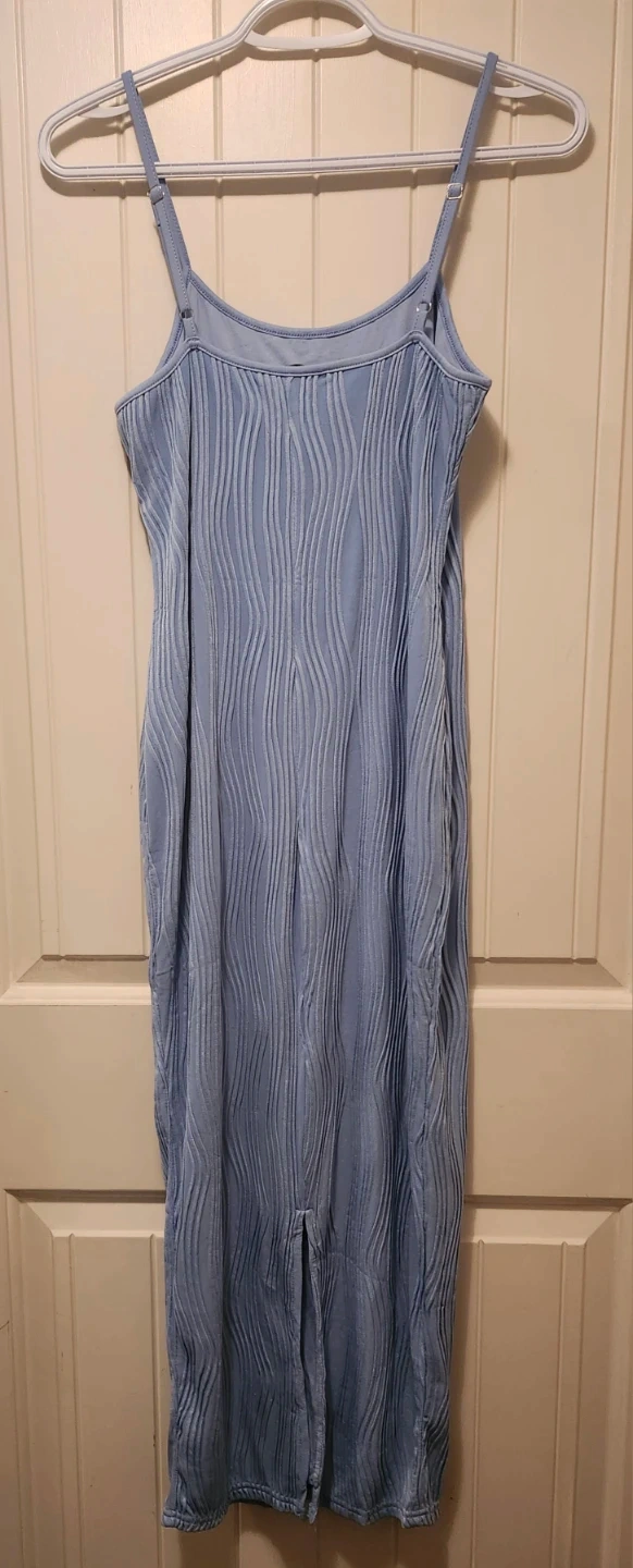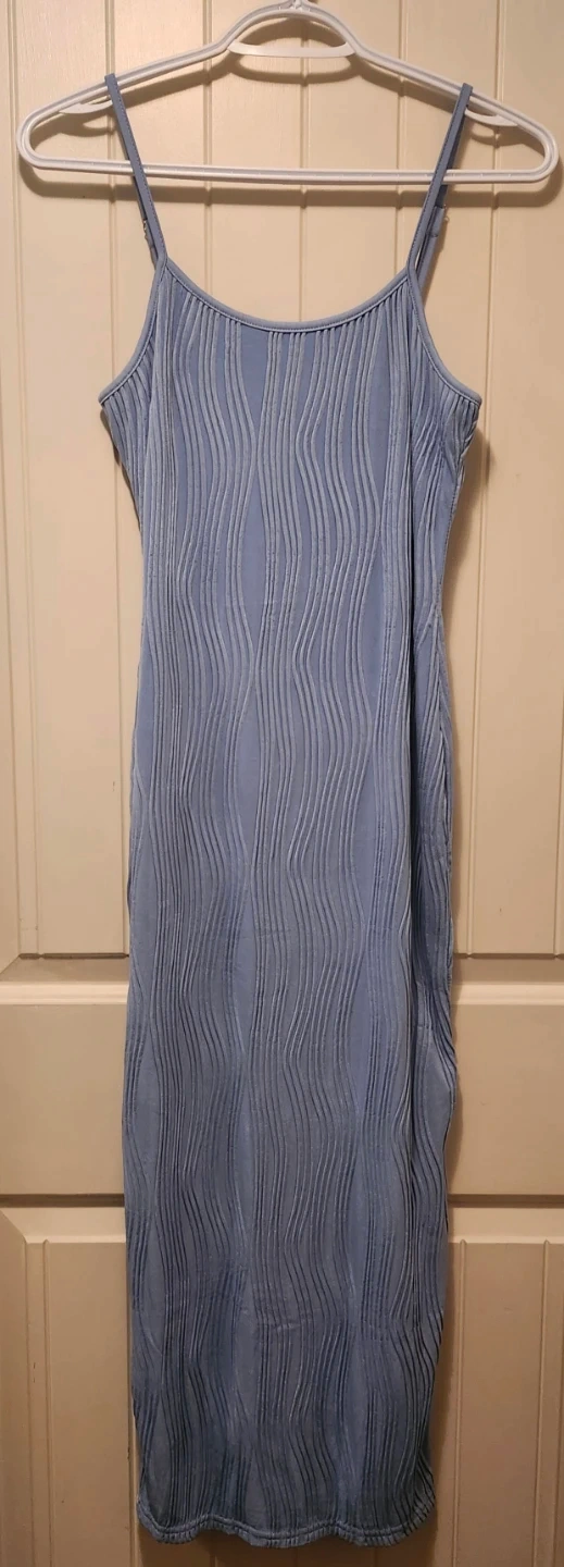 This is a PrettyGarden blue midi dress. It's a size small with a textured wavy pattern all over. Features adjustable spaghetti straps and a slit at the front hem.