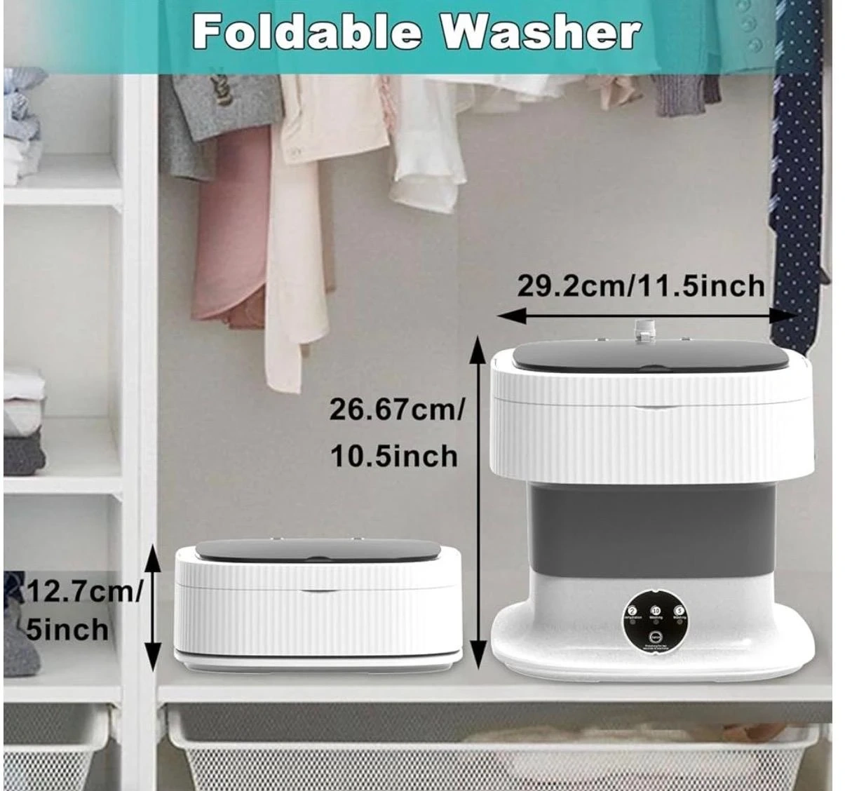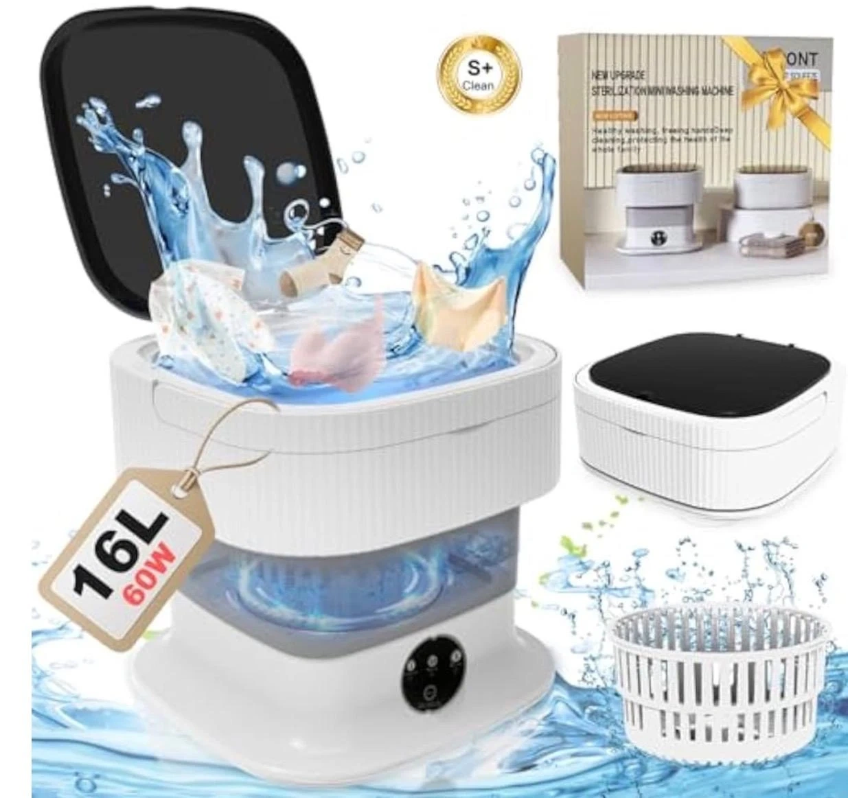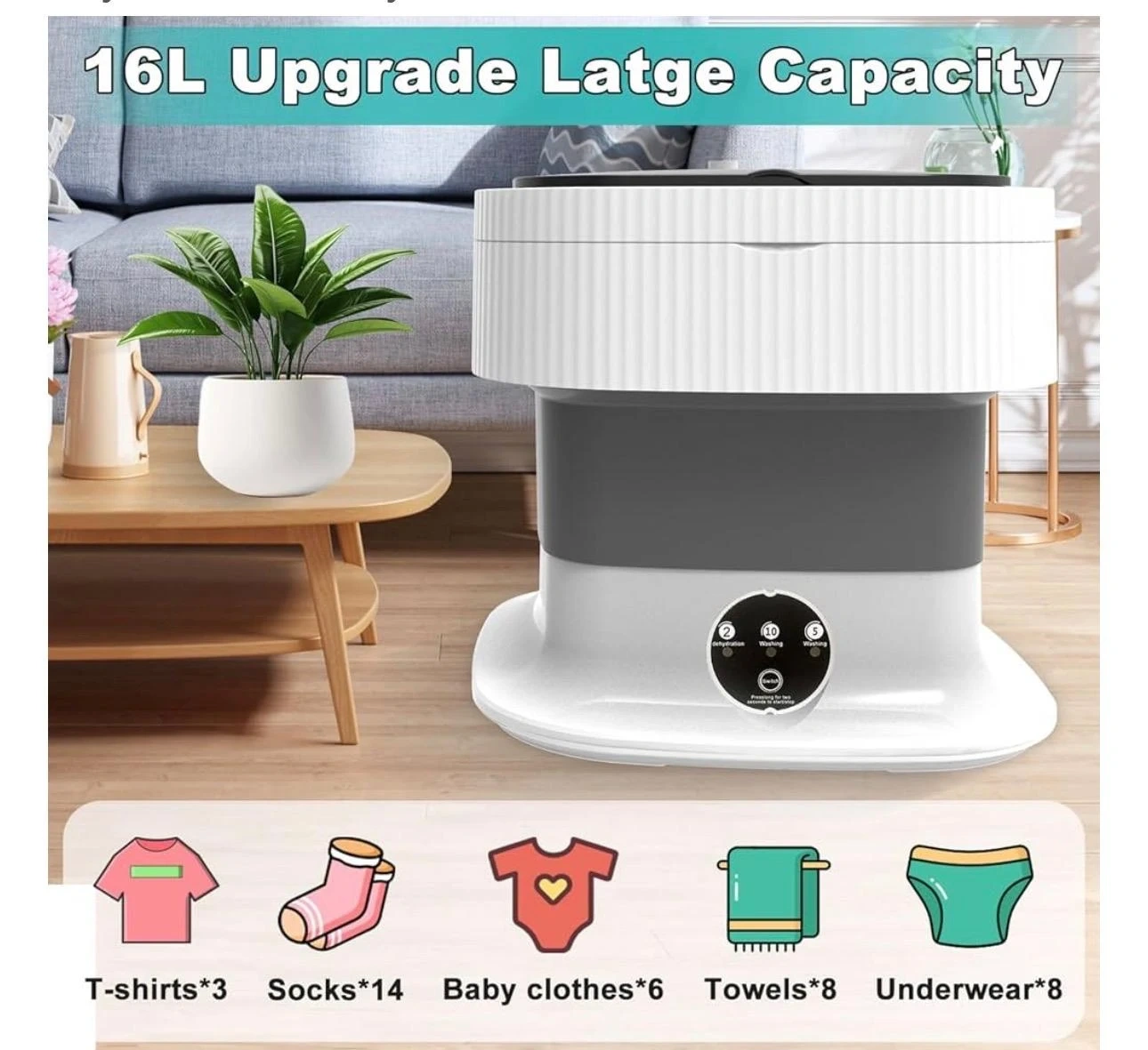 This is a portable, foldable washing machine with a 16L capacity. It offers three washing modes: 2-minute spinner dryer, 5-minute quick wash, and 10-minute standard wash. Great for small loads of laundry like t-shirts, socks, baby clothes, towels, and underwear. Its compact size makes it convenient for travel or small living spaces.
