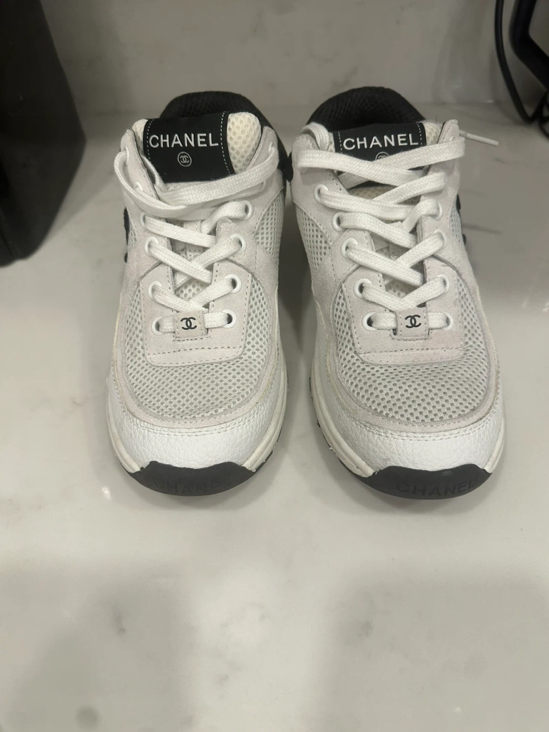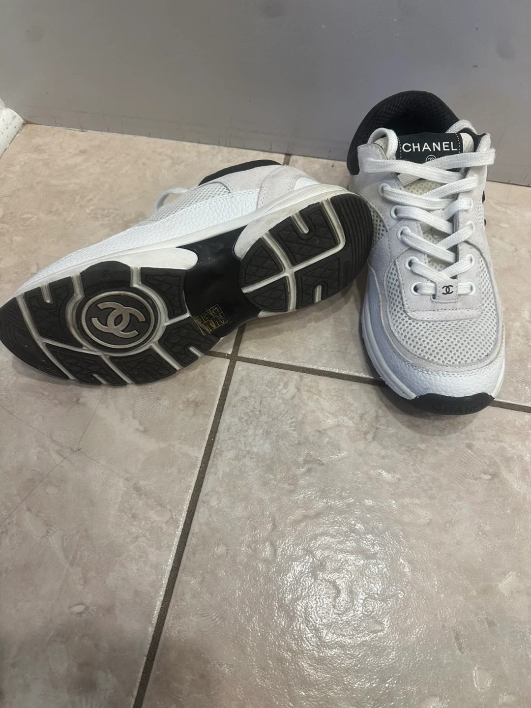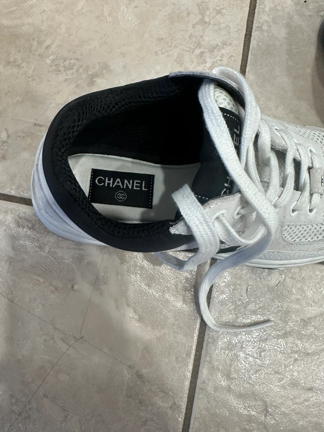 These are white Chanel sneakers. They're made with a mix of leather and mesh materials. The insoles show the Chanel logo.