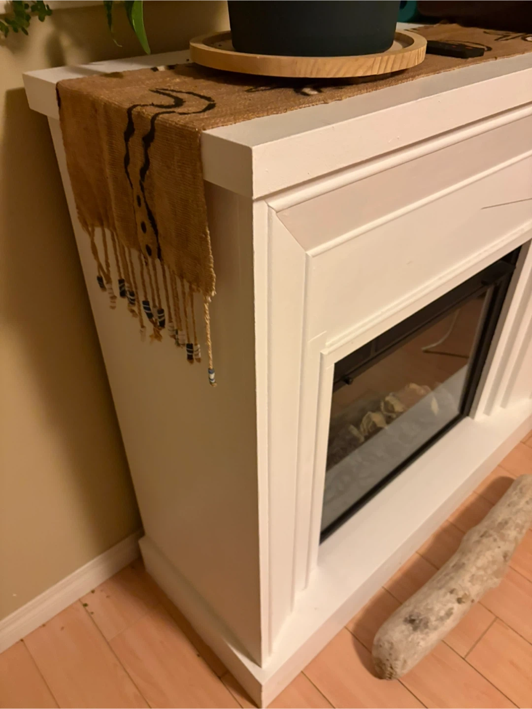 White electric fireplace with realistic log embers. It comes with a remote for easy operation. This unit provides a cozy ambiance.