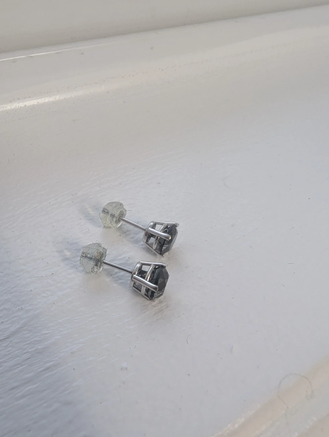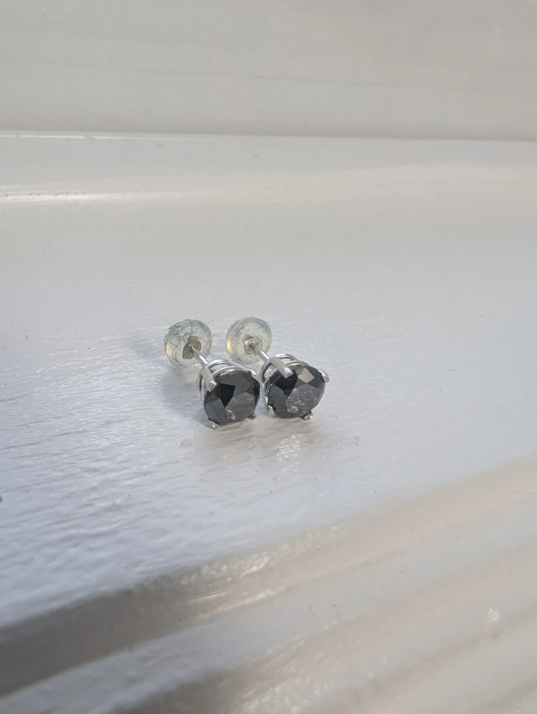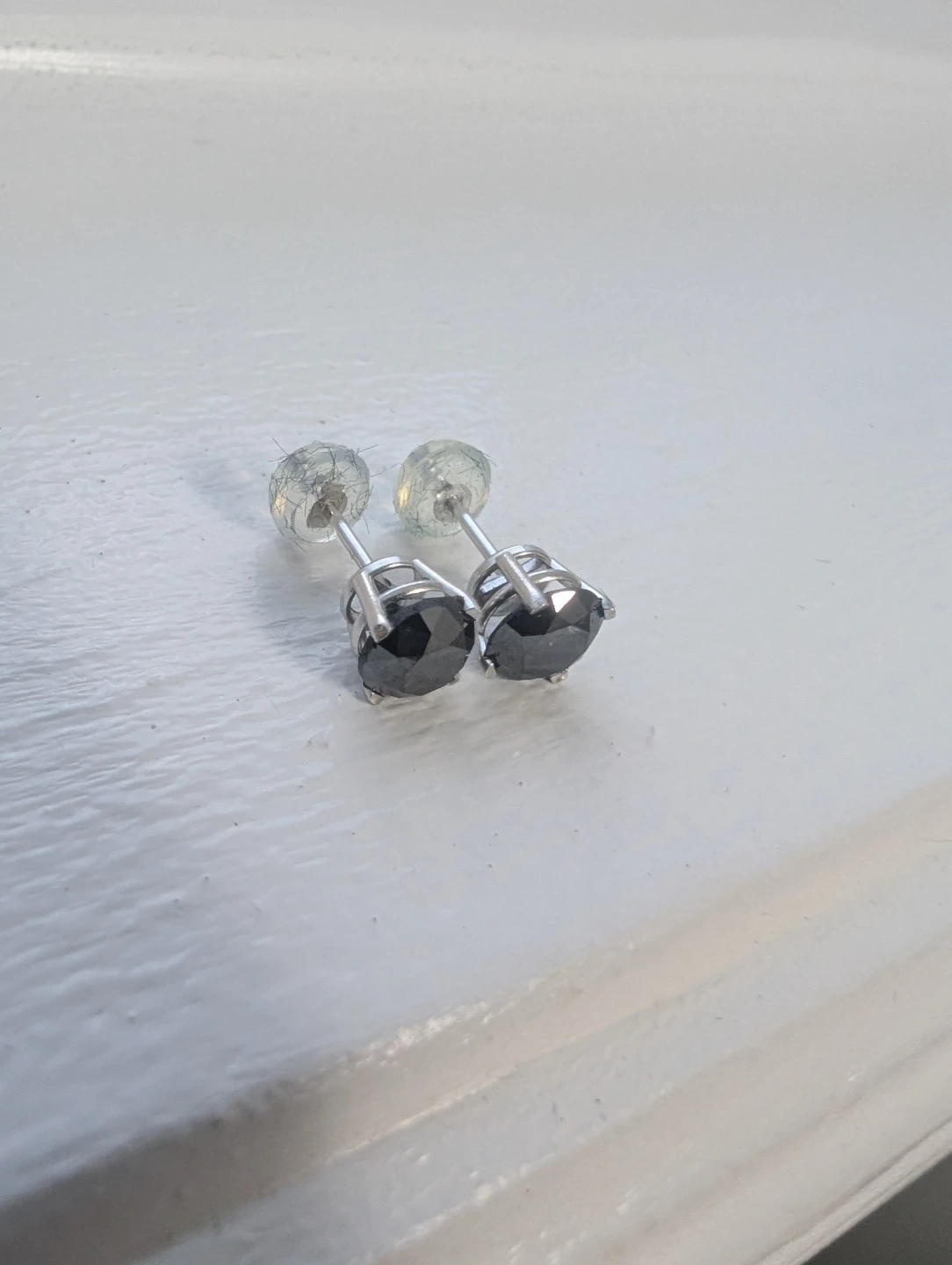 Brand new 14kt white gold two round brilliant cut treated black diamond earrings for sale. Stud earrings, gem stone, 2 round brilliant cut fancy black diamonds, 1.88ct carat. Retail value $1800 plus HST, selling for $600 FIRM. Comes with appraisal.