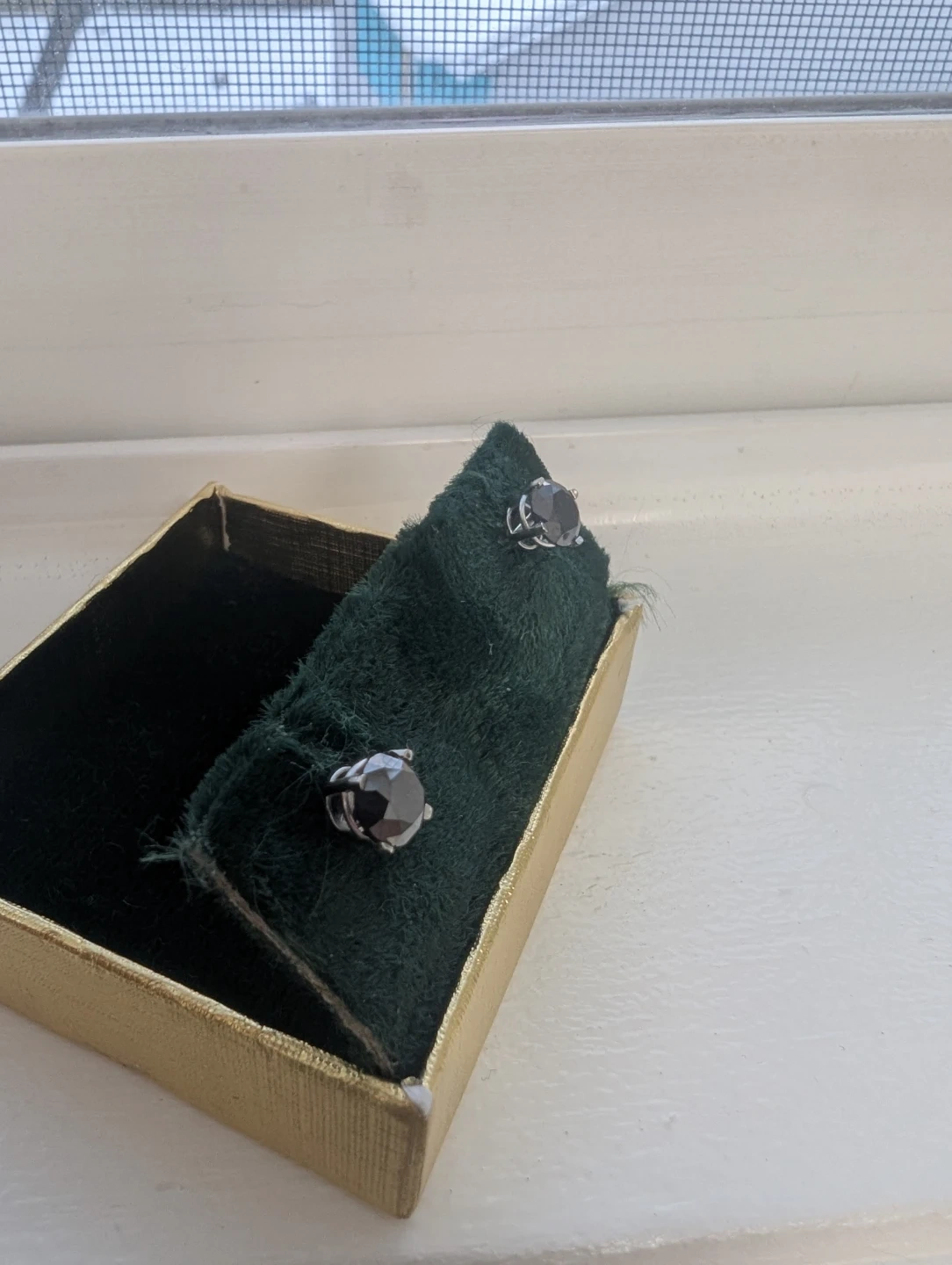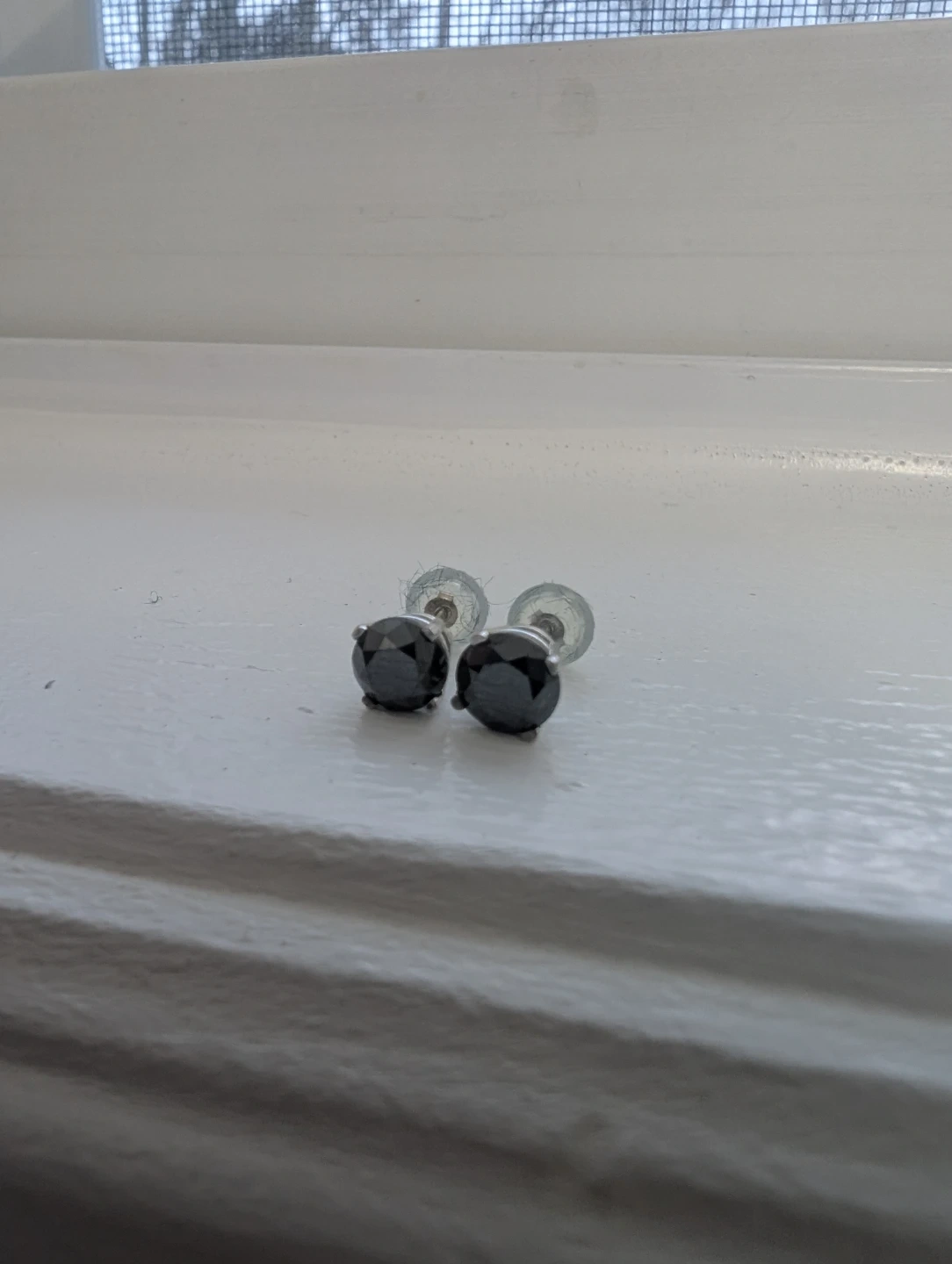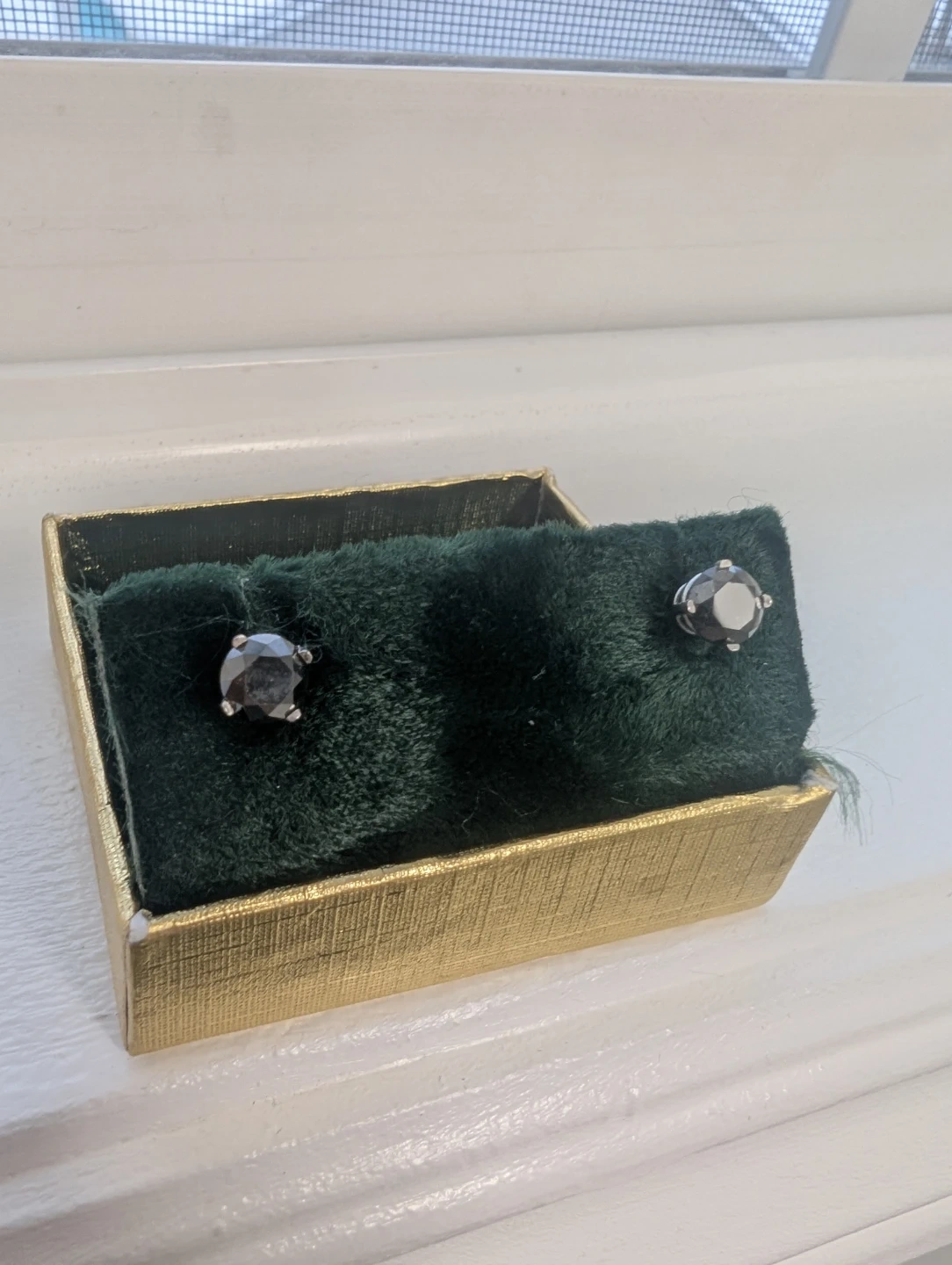 Brand new 14kt white gold two round brilliant cut treated black diamond earrings for sale. Stud earrings, gem stone, 2 round brilliant cut fancy black diamonds, 1.88ct carat. Retail value $1800 plus HST, selling for $600 FIRM. Comes with appraisal.
