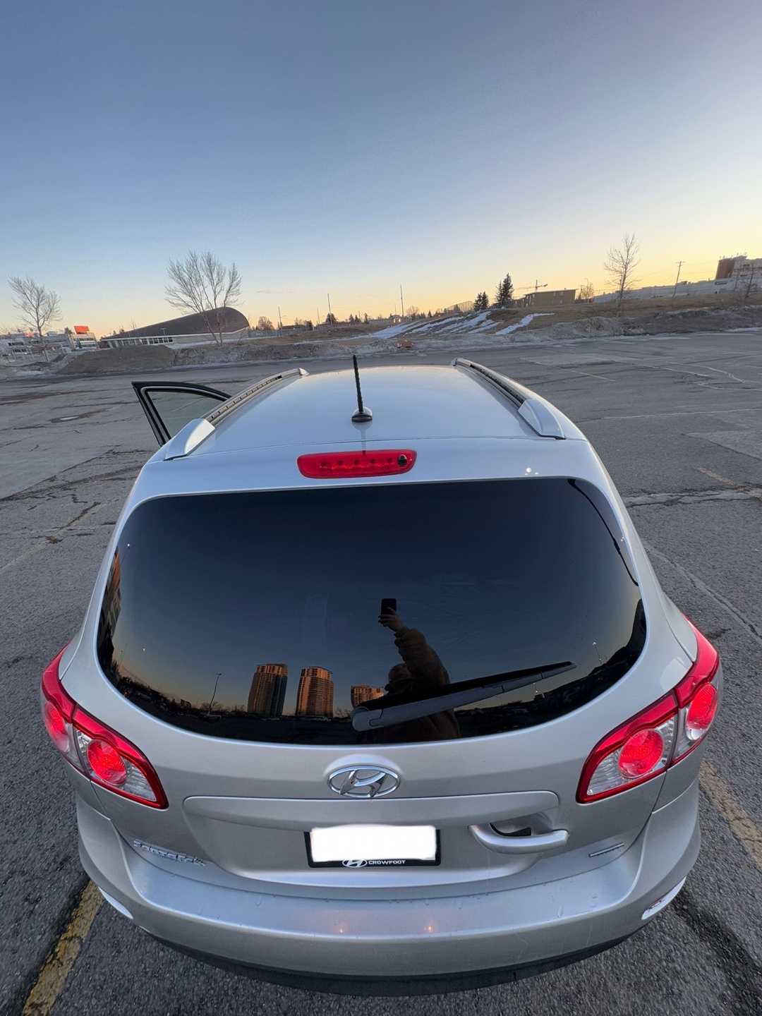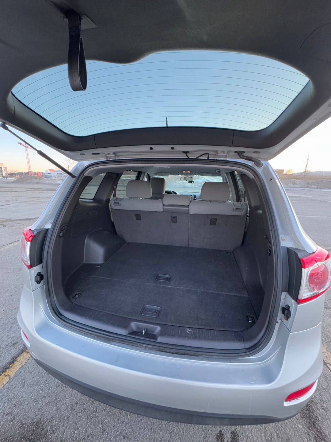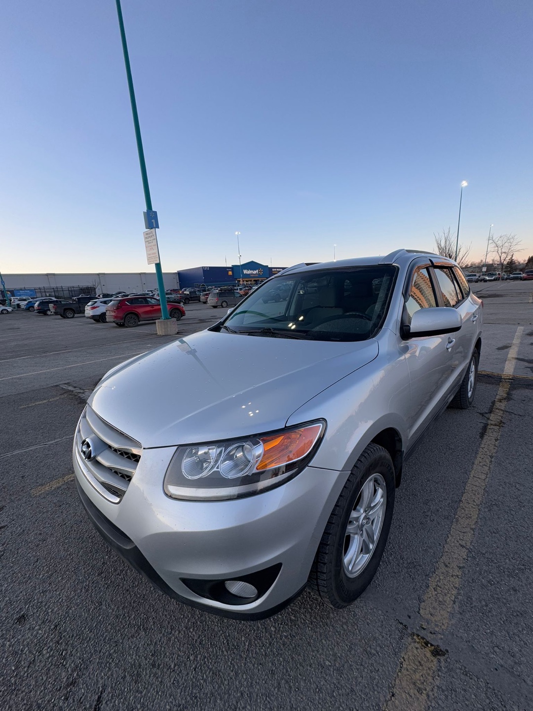 Silver Hyundai Santa Fe . Spacious SUV, good condition. Roomy interior. Clean trunk. Reliable vehicle.