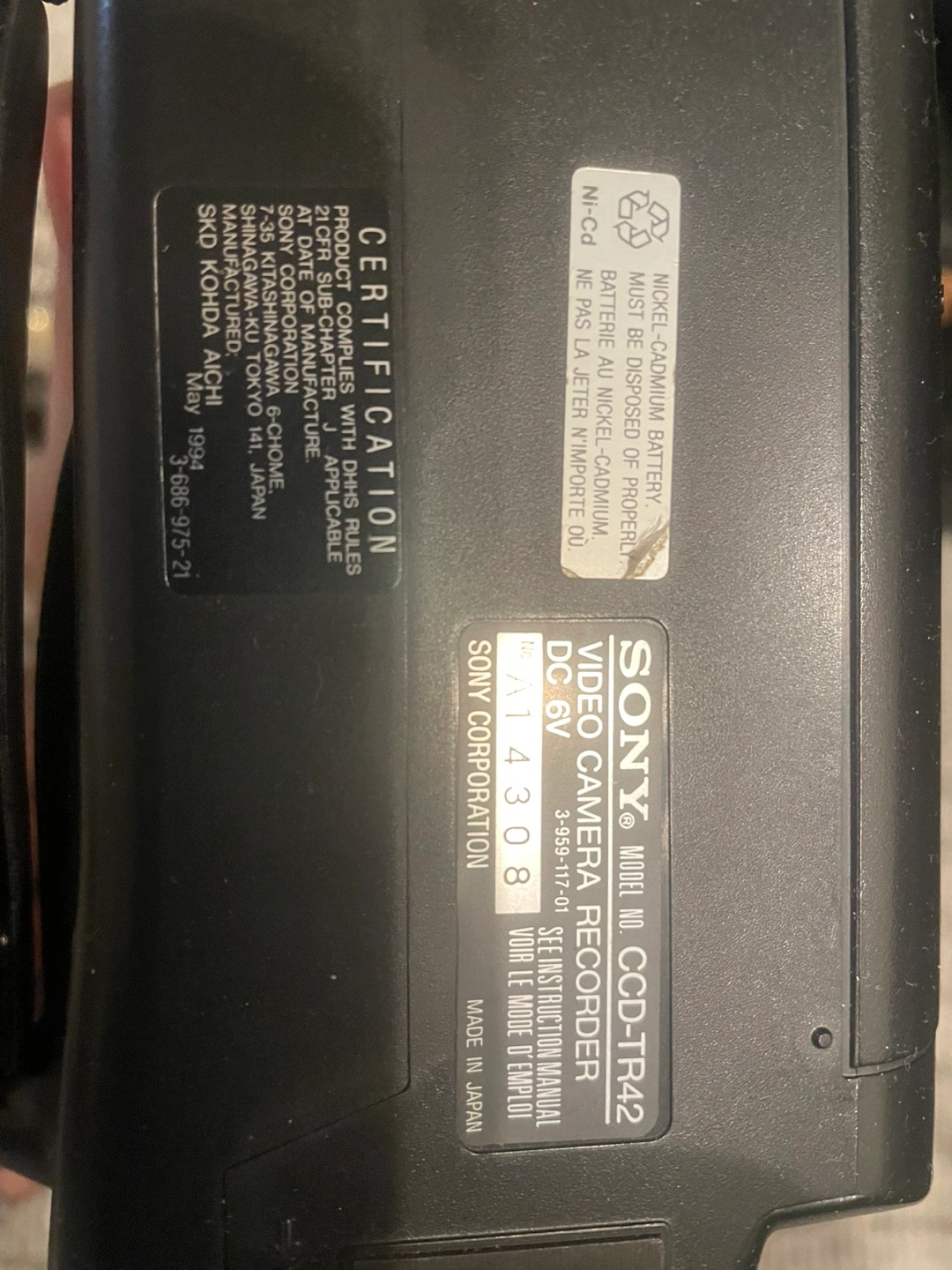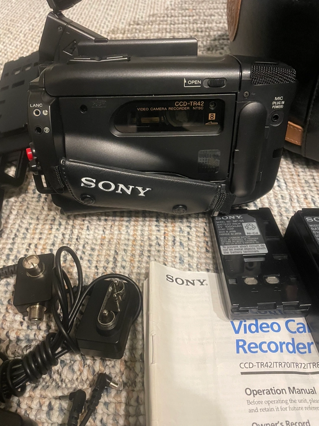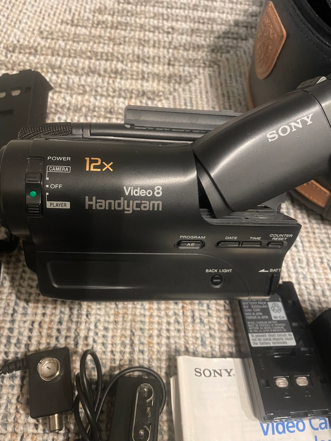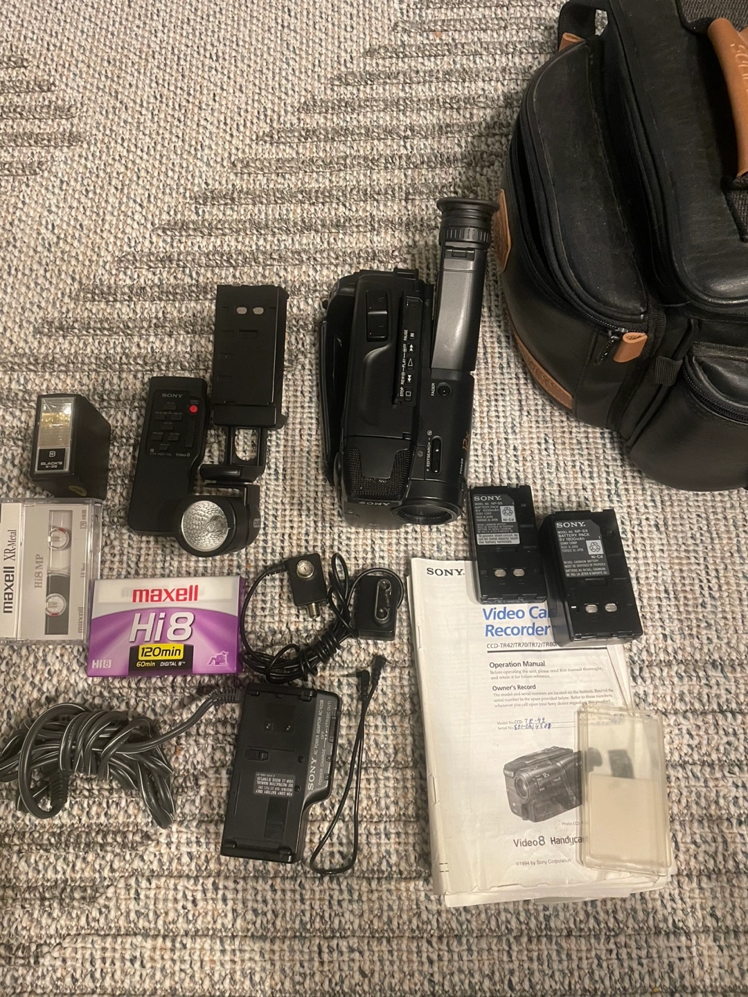 Vintage Sony Hi8 Handycam 8mm video camera recorder. Includes carrying case, two batteries, charger, power cord, instruction manual, and Maxell tapes. Great for collectors or nostalgic film enthusiasts.