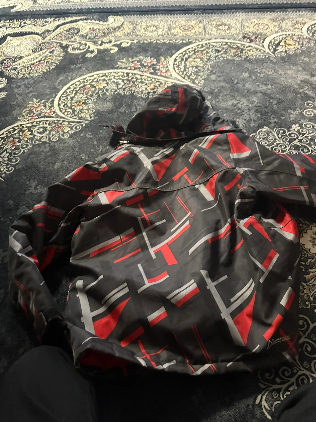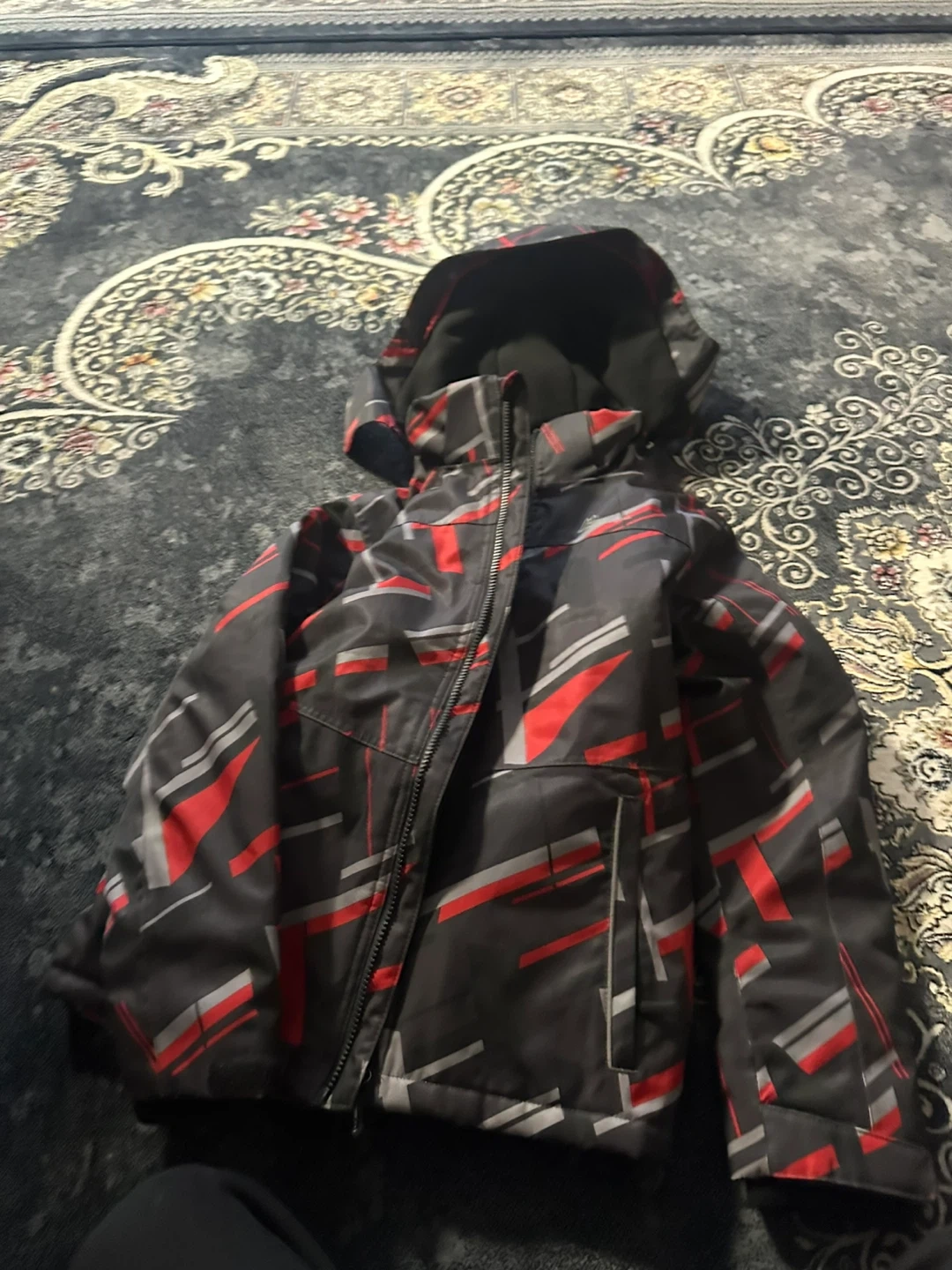 This youth ski jacket has a cool geometric pattern in grey, black, and red. It's designed for warmth and protection on the slopes. Zippered front with pockets and an attached hood.