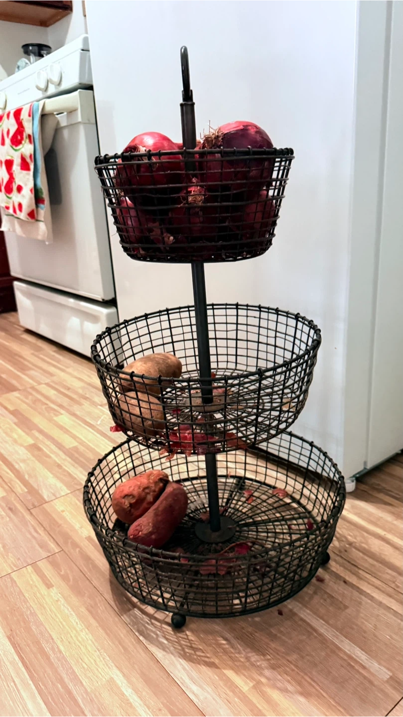 This 3-tier wire basket stand is great for storing produce. It's made of durable metal wire. This stand is perfect for kitchens or pantries!