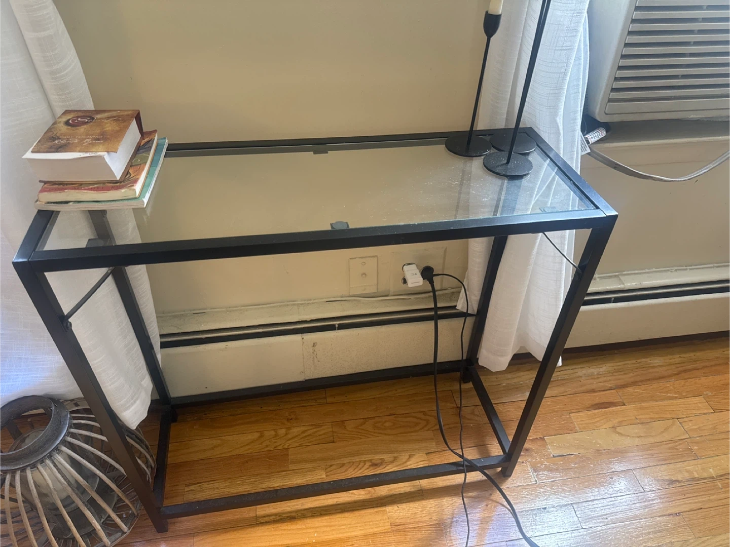 This console table features a clear glass top and a black metal frame. It's perfect for entryway or living room use. The frame is made of durable metal.