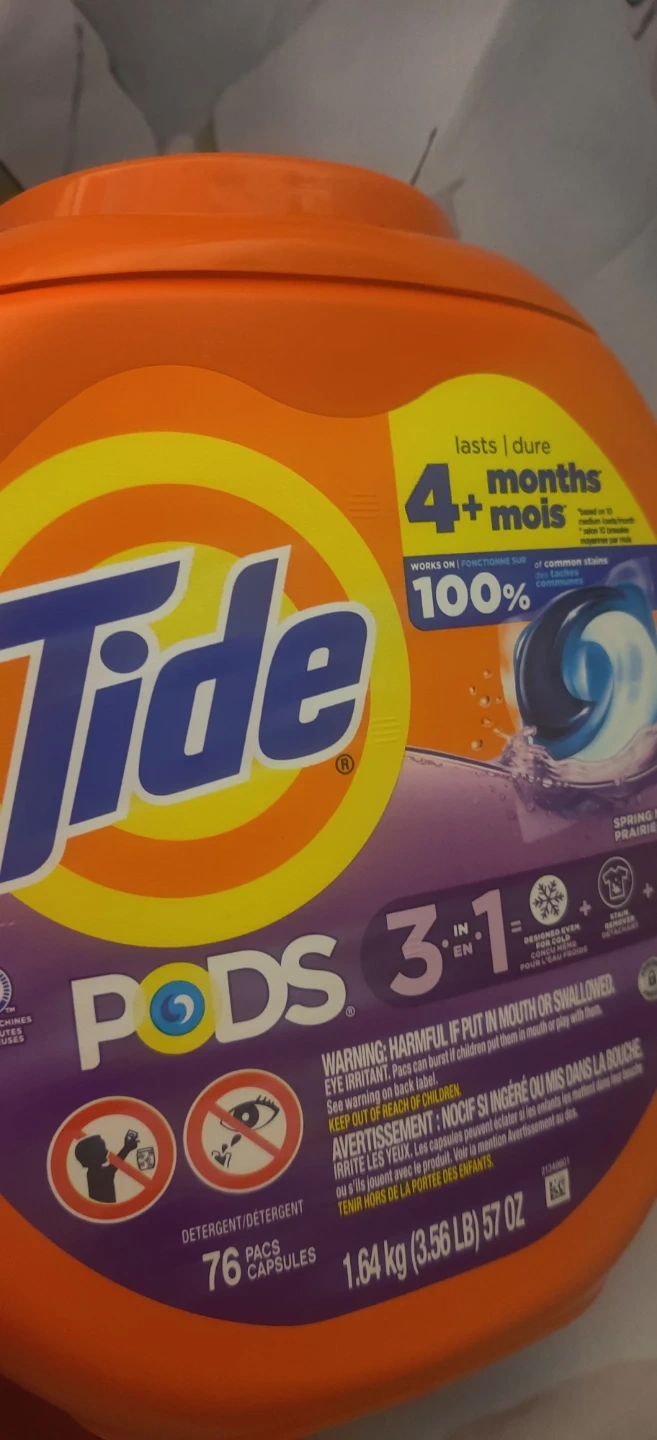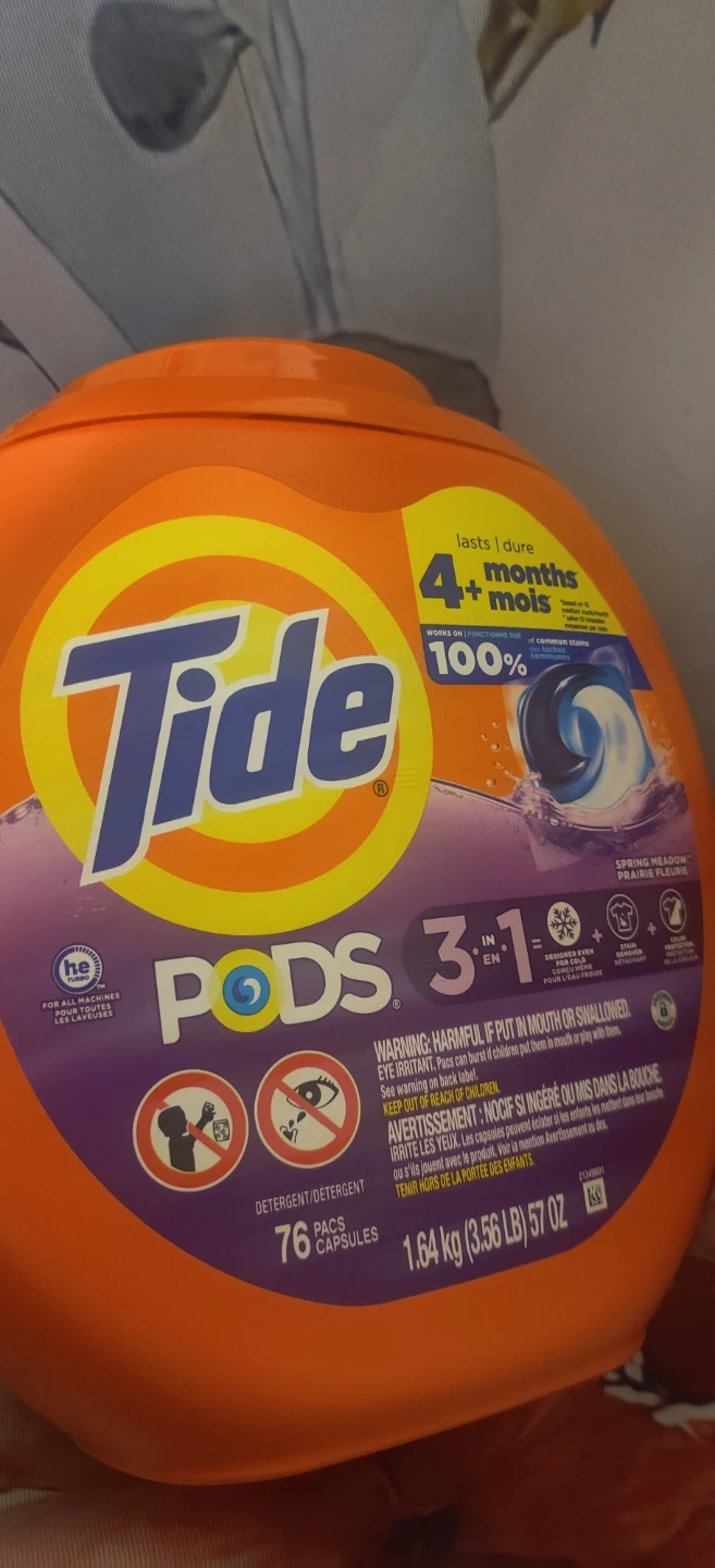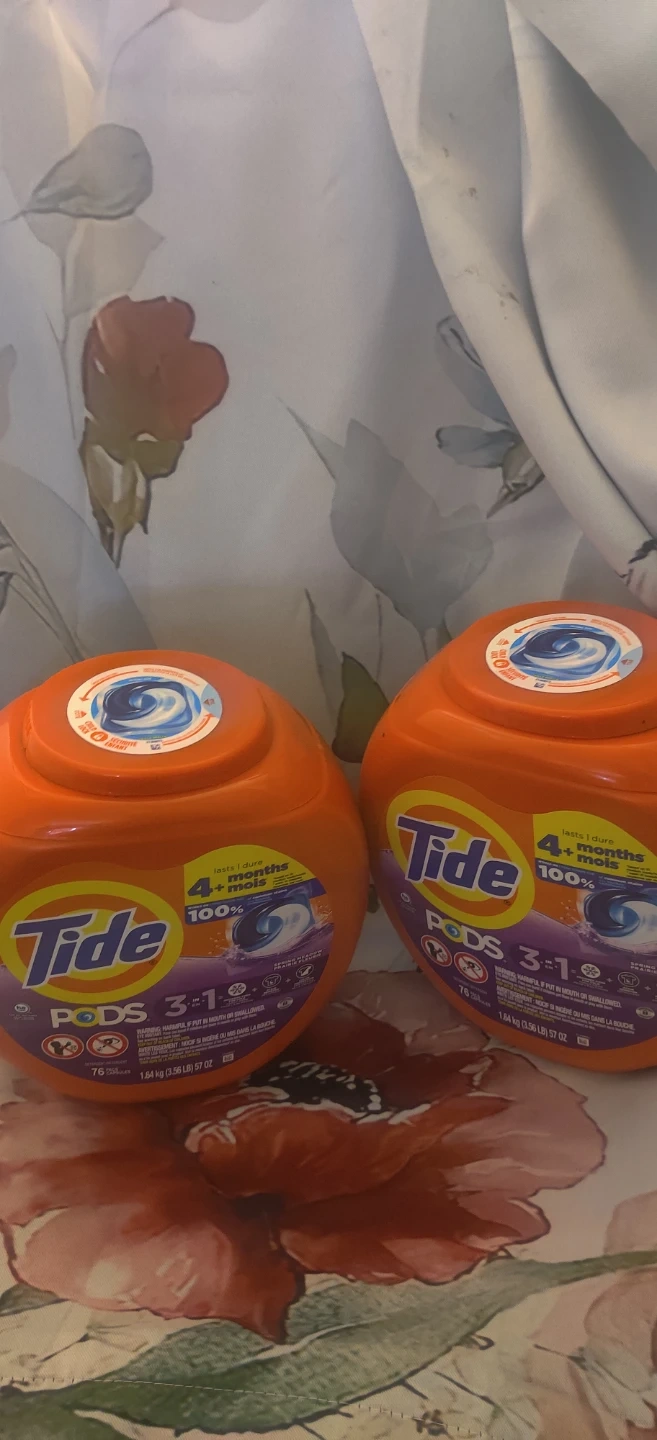 Sellimg 2 tide PODS 3 in 1 detergent with HE compatibility. Includes 76 pods each in a 1.64 kg (3.56 lb) 57 oz container. Works on 100% of common stains. Spring Meadow scent.