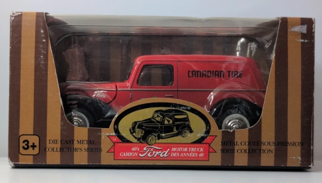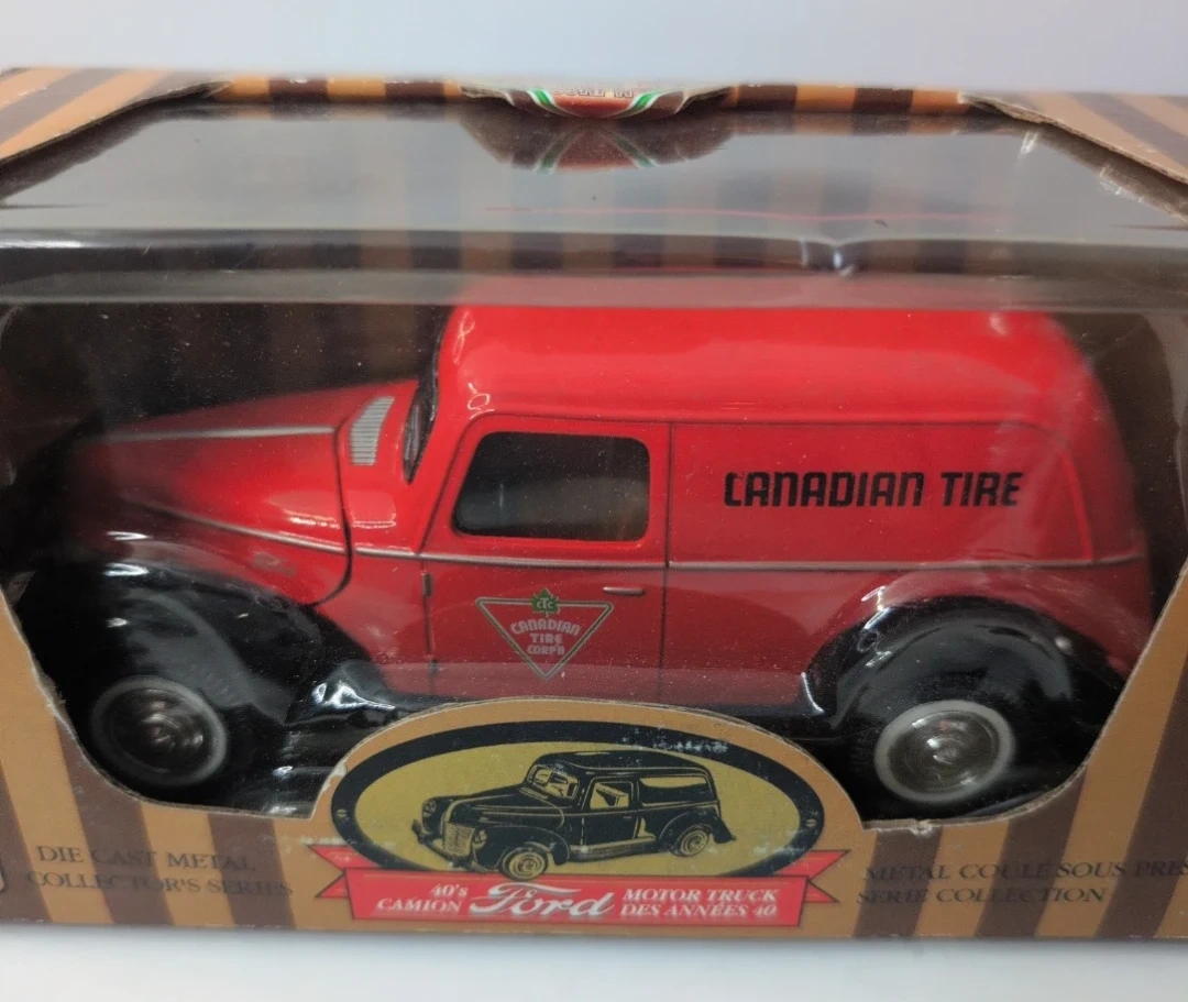 This is a die cast metal collector's series 1940s Ford motor truck. It's a red enamel finish with "Canadian Tire" printed on the side. The truck features opening doors and hood, revealing a V-8 engine replica. It also has working rubber tires, and the front doors, hood, and hubcaps are chrome.