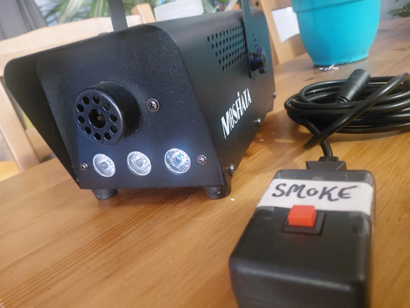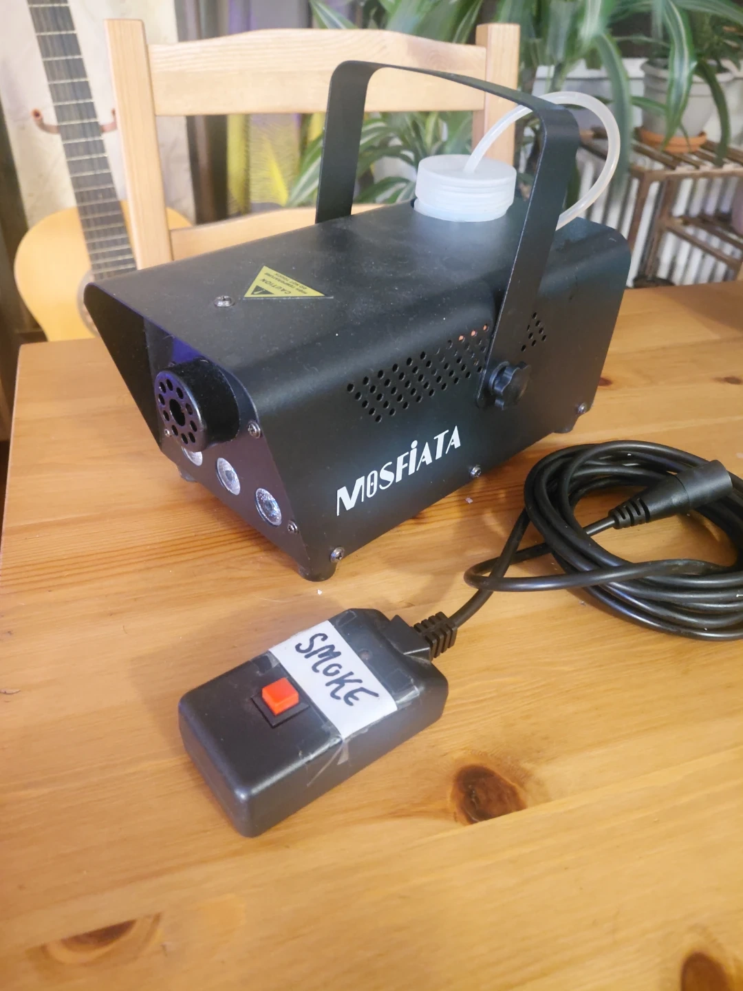 This is a black MOSFIATA smoke machine with a wired remote. It includes the power cord and wired remote. It's great for parties or events!