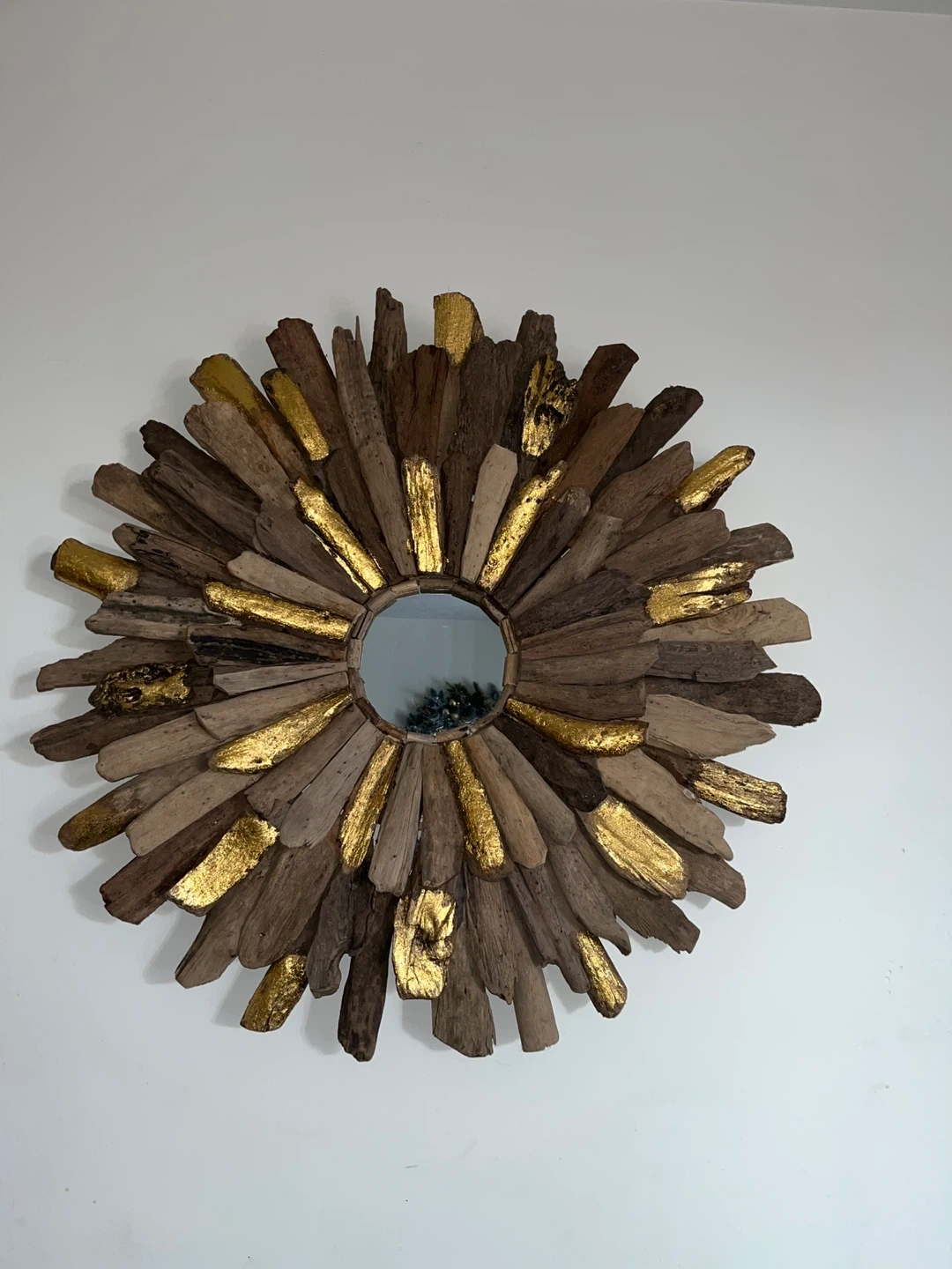 Unique sunburst-style mirror featuring natural driftwood pieces accented with gold detailing. It's a striking decorative piece for any room. The frame is made of wood and gold leaf.