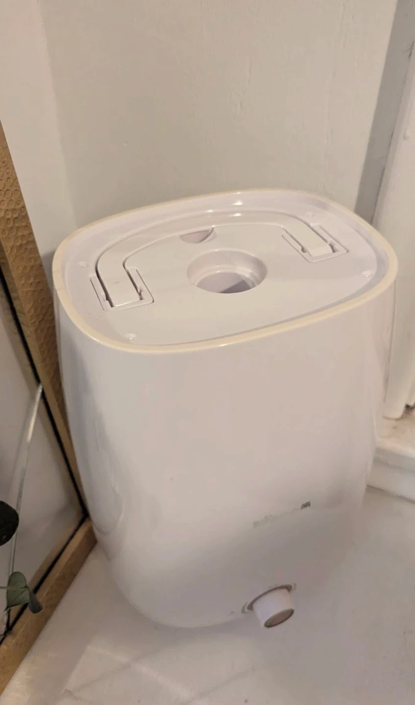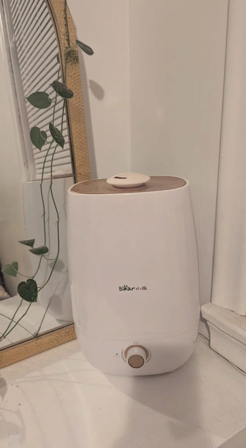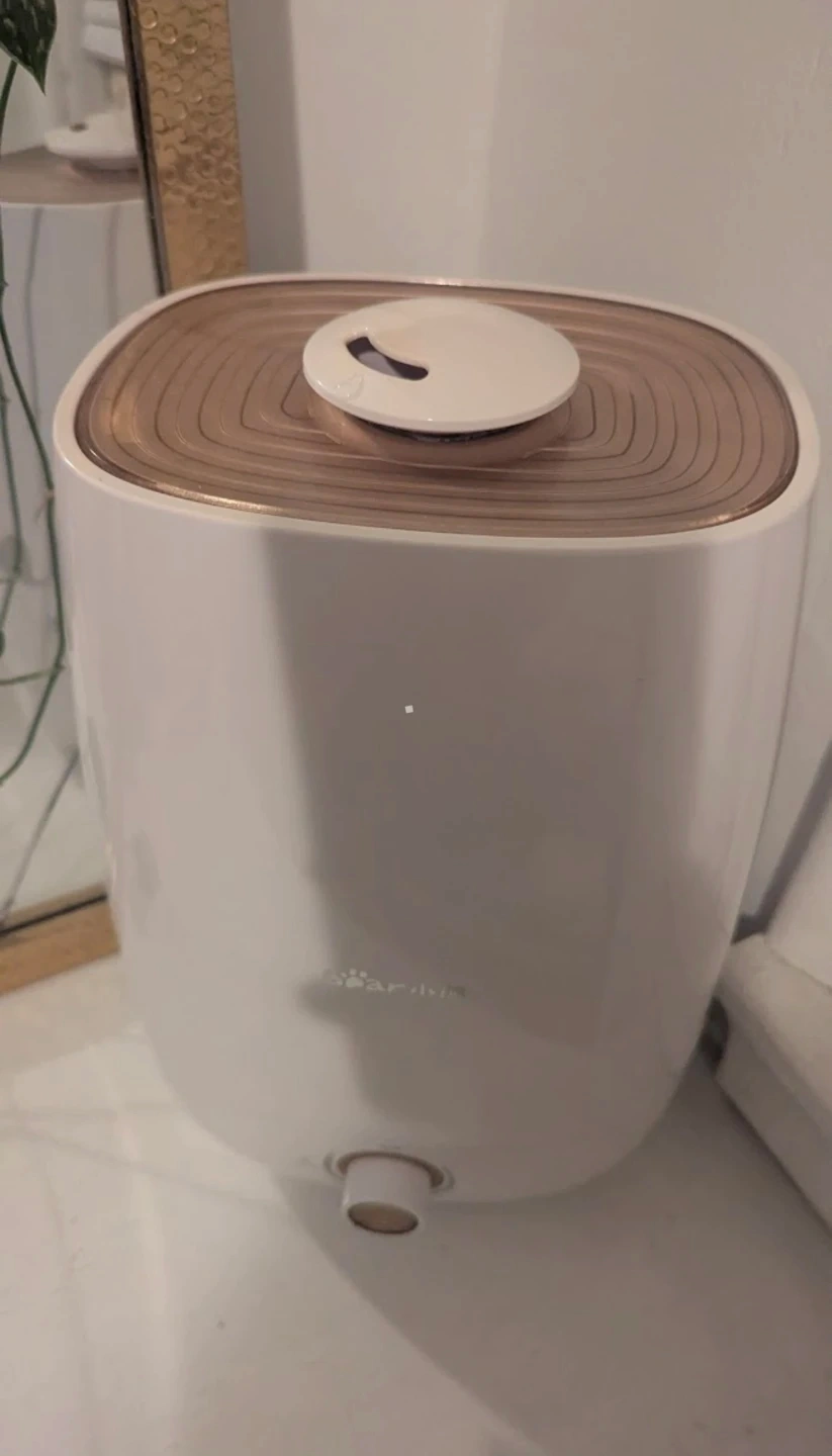 Bear brand humidifier. It has a white exterior with a golden accent on the top. Larger water tank so has to be refilled less-frequently. Adjustable dial to control mist volume. The plastic has yellowed slightly in spots just from sunlight shining through the window. Smoke-free, dog-friendly home. Pick-up in Belgravia