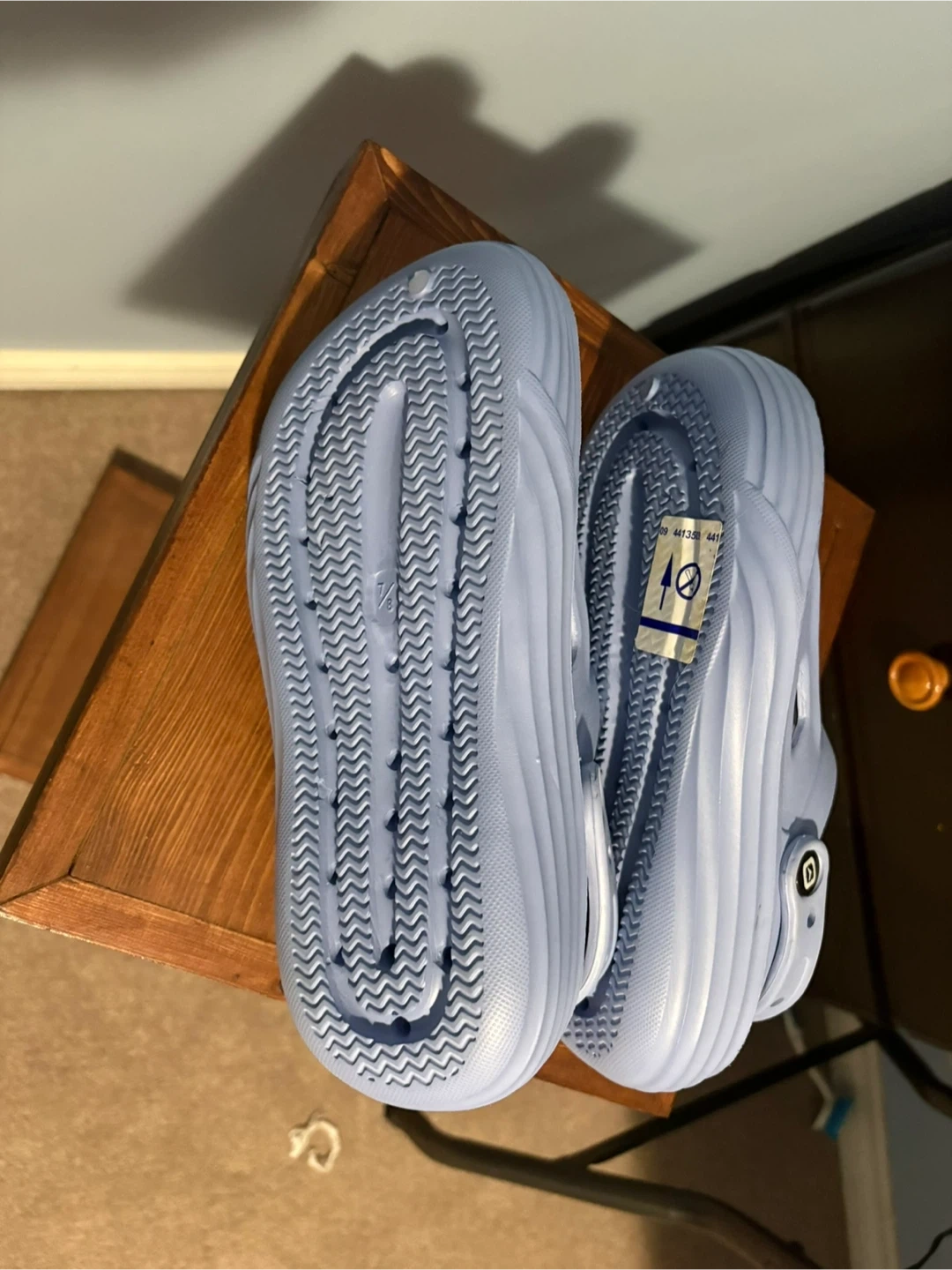 These brand new light bluey/purple clogs are a size women's US 7/8. They're made of a durable, easy-to-clean material. These would be great for gardening or casual wear!