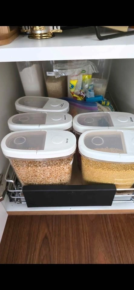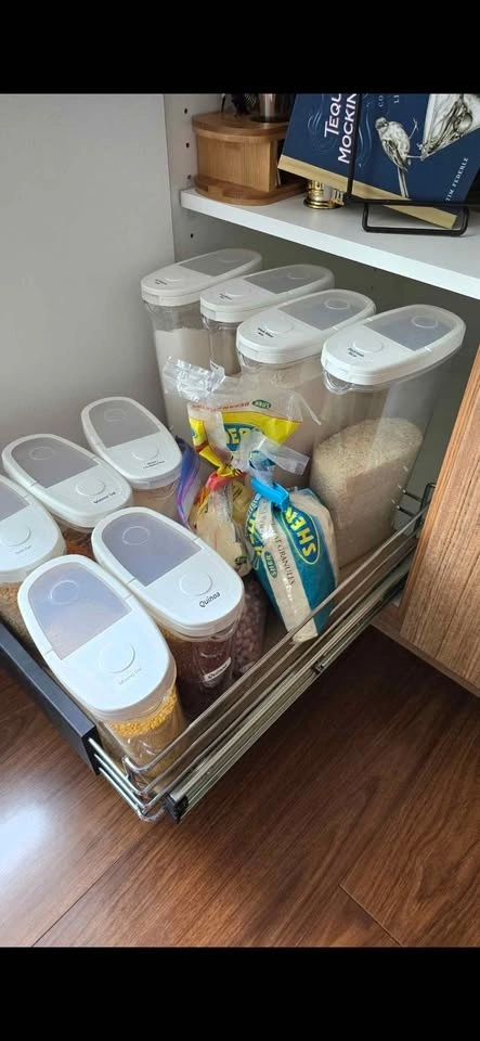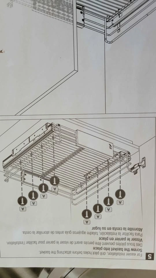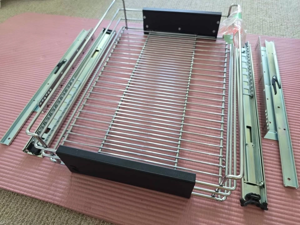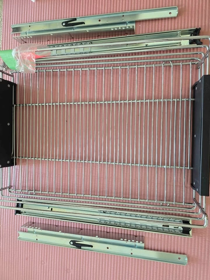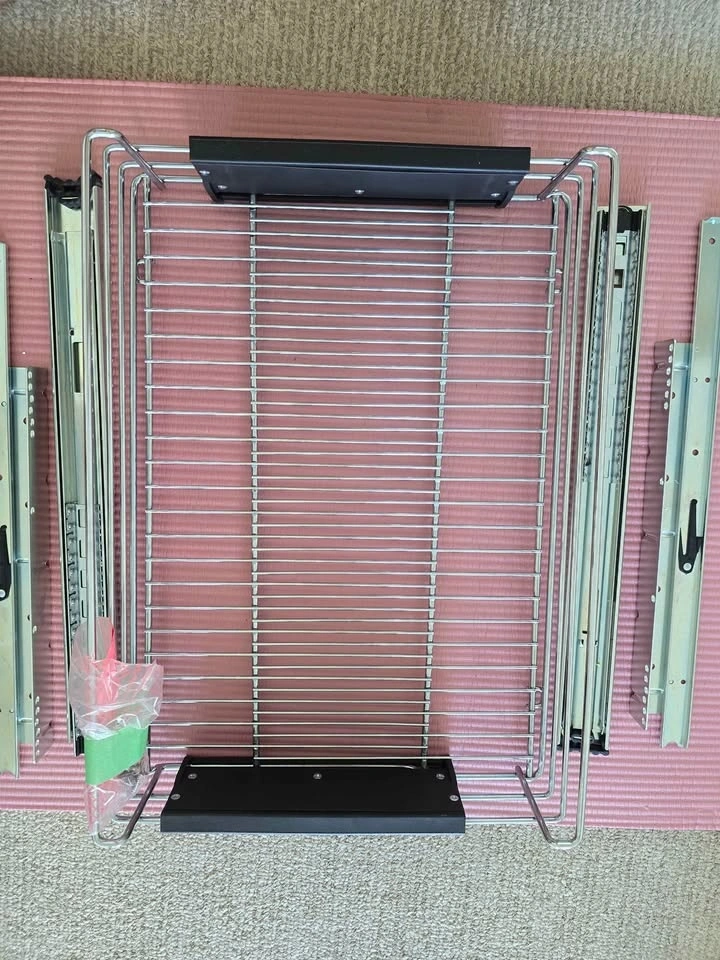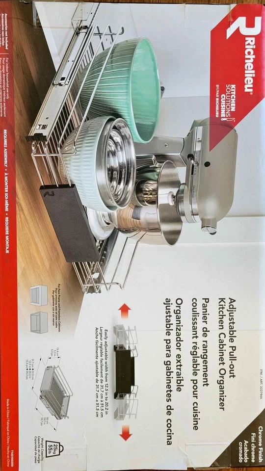 Adjustable Richelieu pull-out kitchen cabinet organizer. Chrome finish. Width adjusts from 12.5 in to 20.2 in, depth is 19.7 in. Requires assembly. Pickup only in Coquitlam.