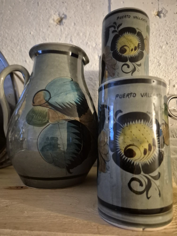 Selling a pitcher and six matching mugs with a Puerto Vallarta design. They feature a unique floral pattern and would be a great addition to any kitchen or collection!