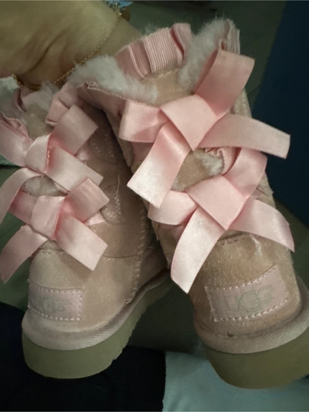 These adorable UGG boots are in a lovely shade of pink and feature cute ribbon bows! They're perfect for keeping your little one's feet warm and stylish. They show some signs of wear.