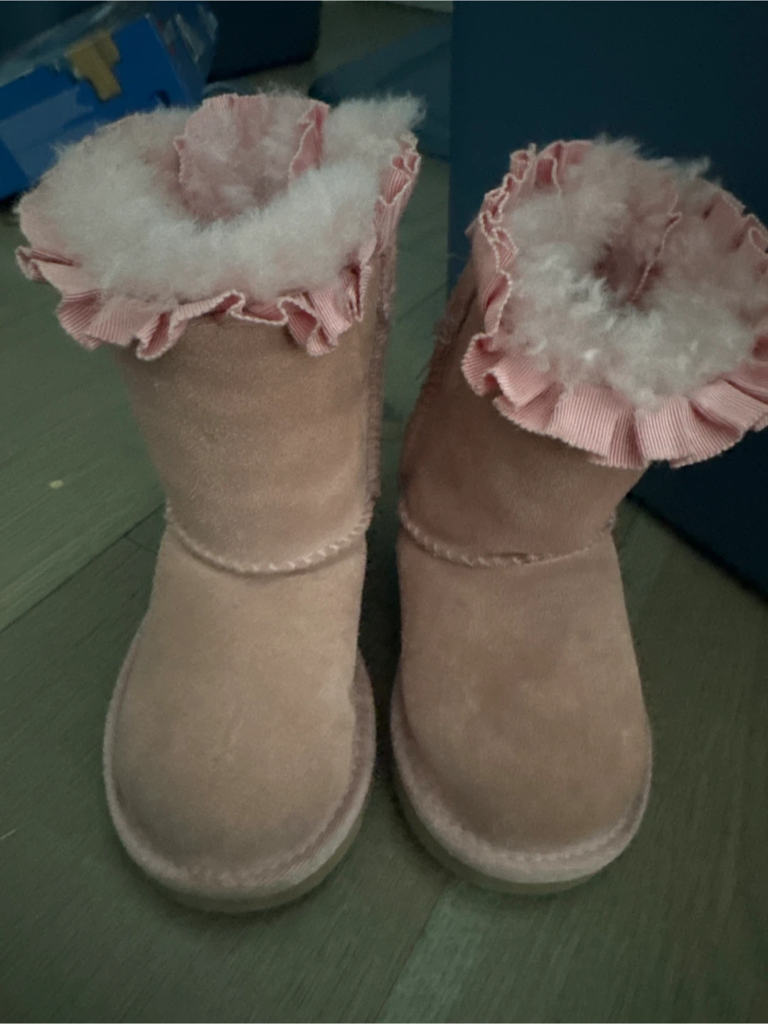 These adorable UGG boots are in a lovely shade of pink and feature cute ribbon bows! They're perfect for keeping your little one's feet warm and stylish. They show some signs of wear.