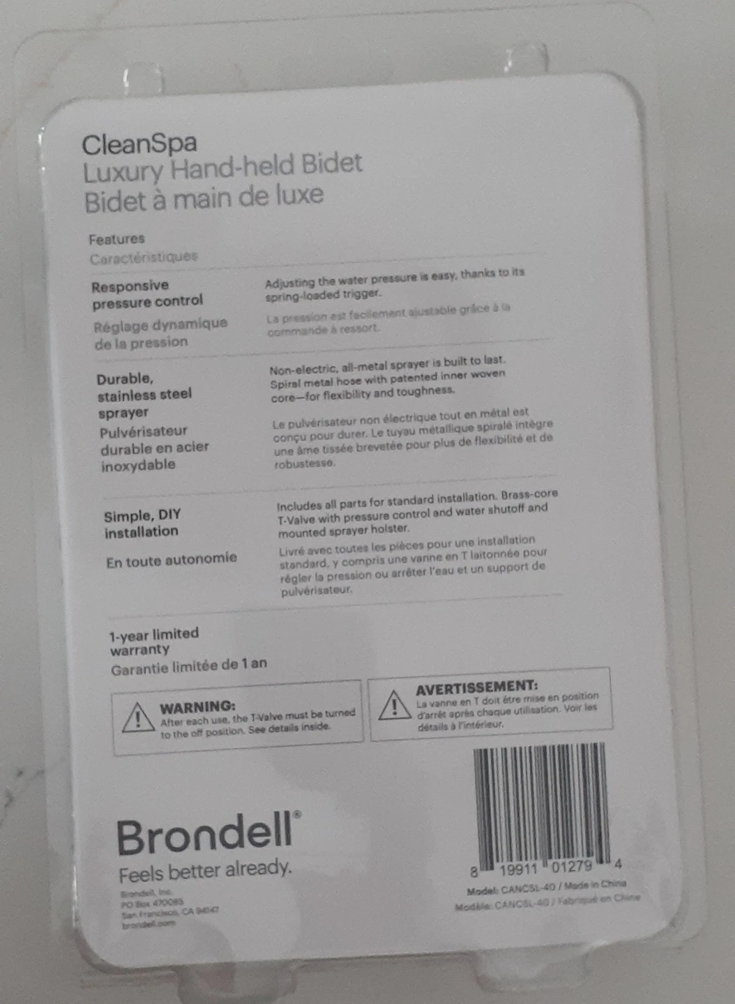 I am selling a new Brondell CleanSpa Luxury Hand-held Bidet. This bidet features responsive pressure control and a durable stainless steel sprayer. It offers a simple, DIY installation with all parts included for standard installation, including a valve with pressure control and a wall shutoff and mounted sprayer holster. The unit is also backed by a 1-year limited warranty.