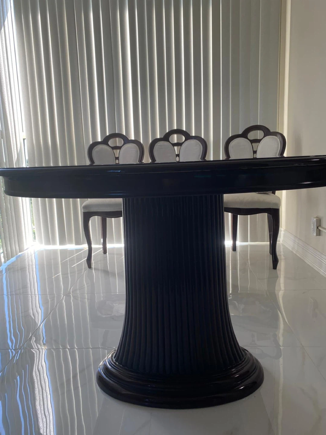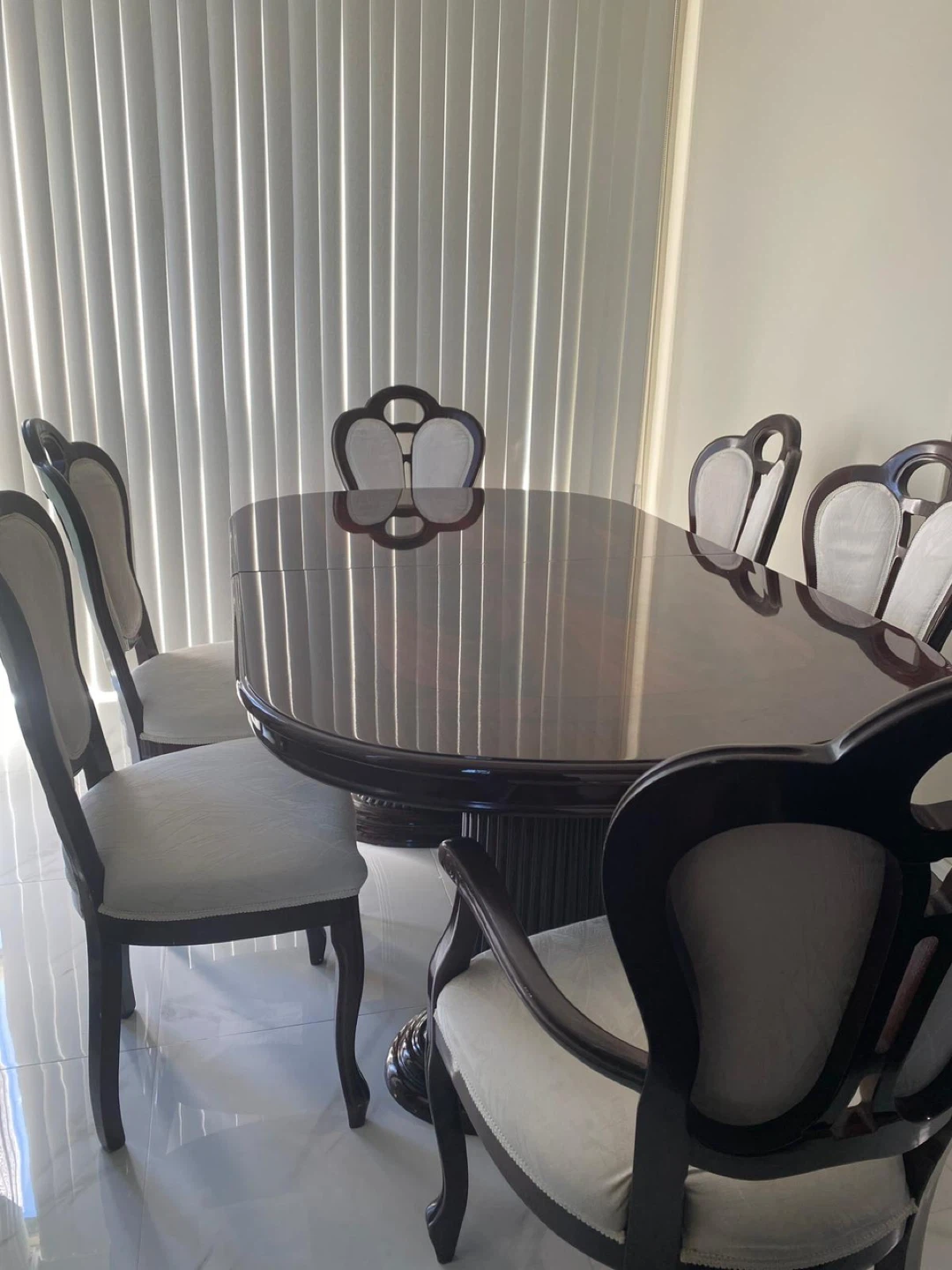 A spacious oval dining table with a dark wood finish. It comes with six upholstered chairs featuring light-coloured seats and backs. This set is perfect for family dinners and entertaining guests.