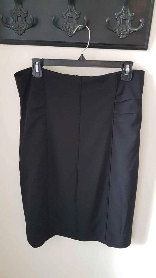 Women's Size 12 Ricki's Black Pencil Skirt. Fully lined. Gathering detail on each side front. Polyester/rayon/spandex blend. Wash and hang to dry. Has been washed. Back zip and slit. 24" long from waist to hem. Hardly worn. Smoke/pet free home. Pick up west end of Peterborough near Glenforest. $5