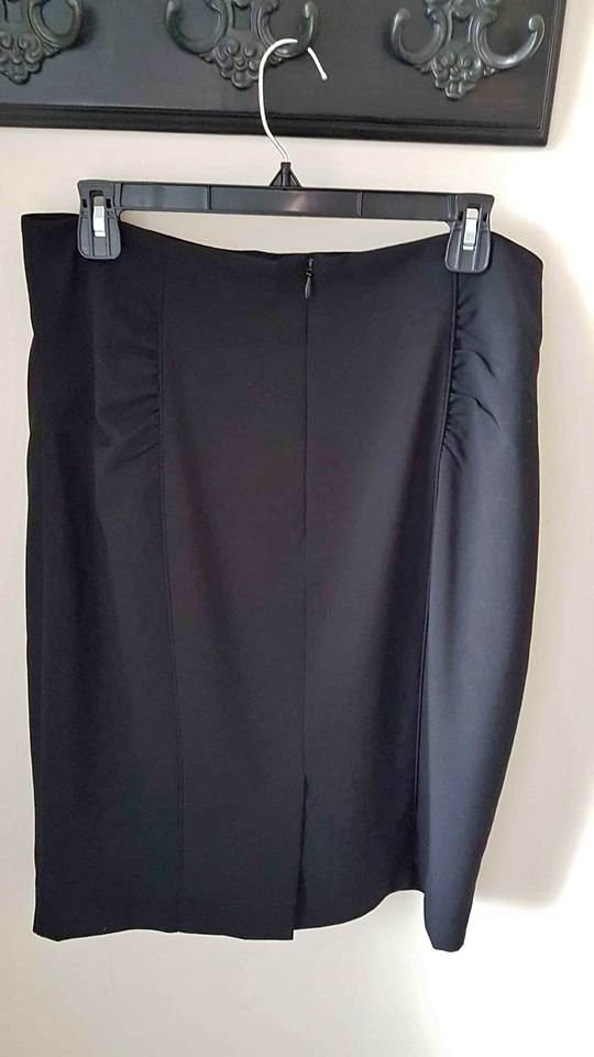 Women's Size 12 Ricki's Black Pencil Skirt. Fully lined. Gathering detail on each side front. Polyester/rayon/spandex blend. Wash and hang to dry. Has been washed. Back zip and slit. 24" long from waist to hem. Hardly worn. Smoke/pet free home. Pick up west end of Peterborough near Glenforest. $5