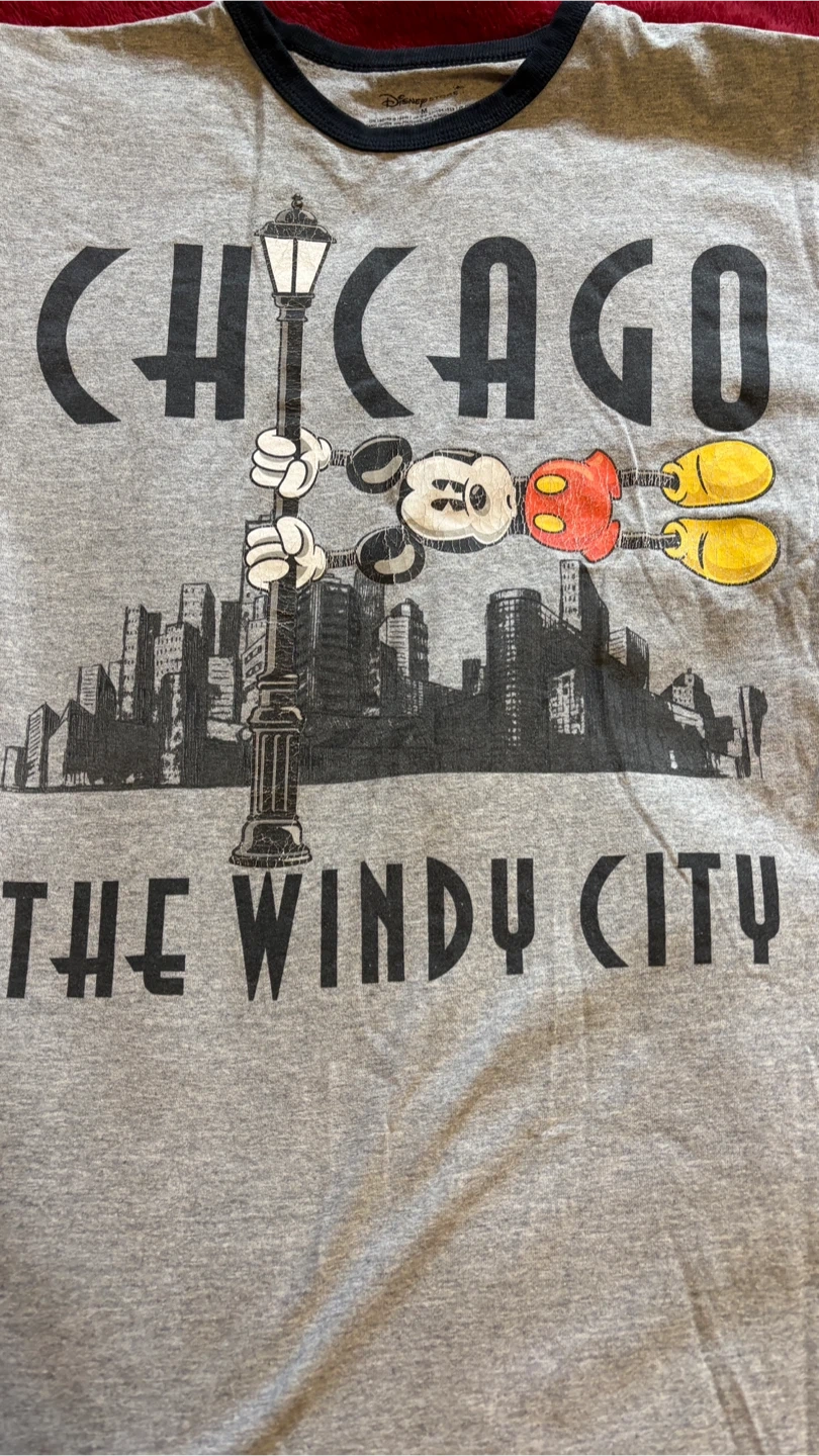 Selling a Disney Store t-shirt featuring a Chicago design with Mickey Mouse! It's a size medium and in great condition. The shirt is made of 90% organic cotton and 10% polyester, making it super comfy!