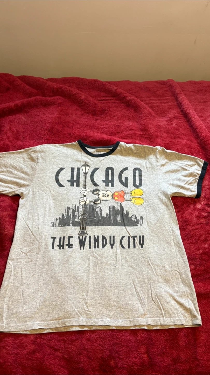 Selling a Disney Store t-shirt featuring a Chicago design with Mickey Mouse! It's a size medium and in great condition. The shirt is made of 90% organic cotton and 10% polyester, making it super comfy!