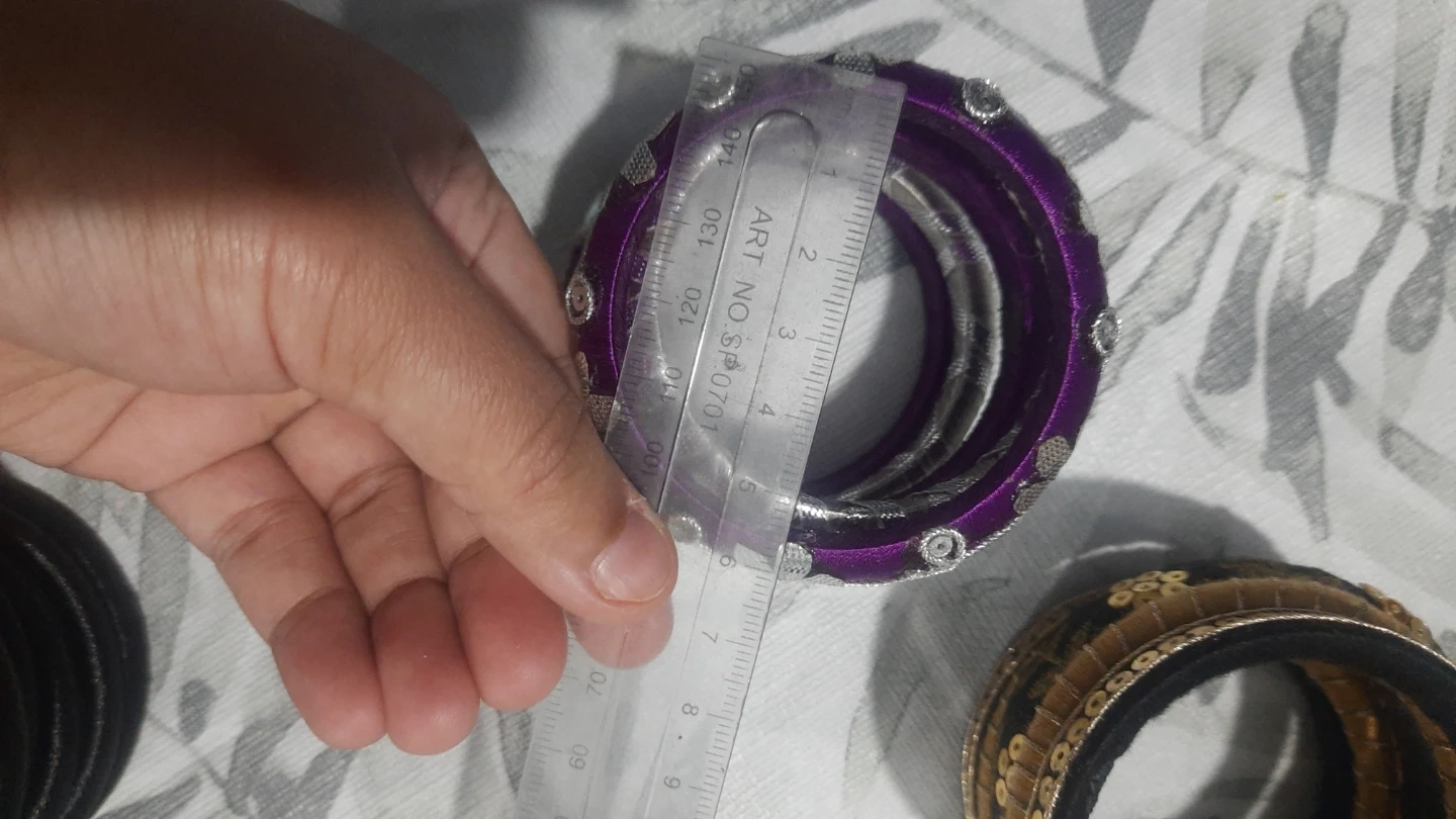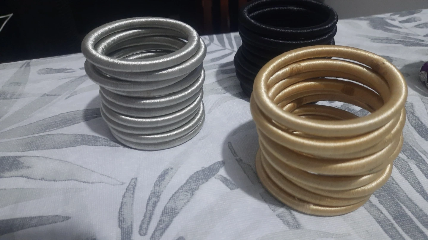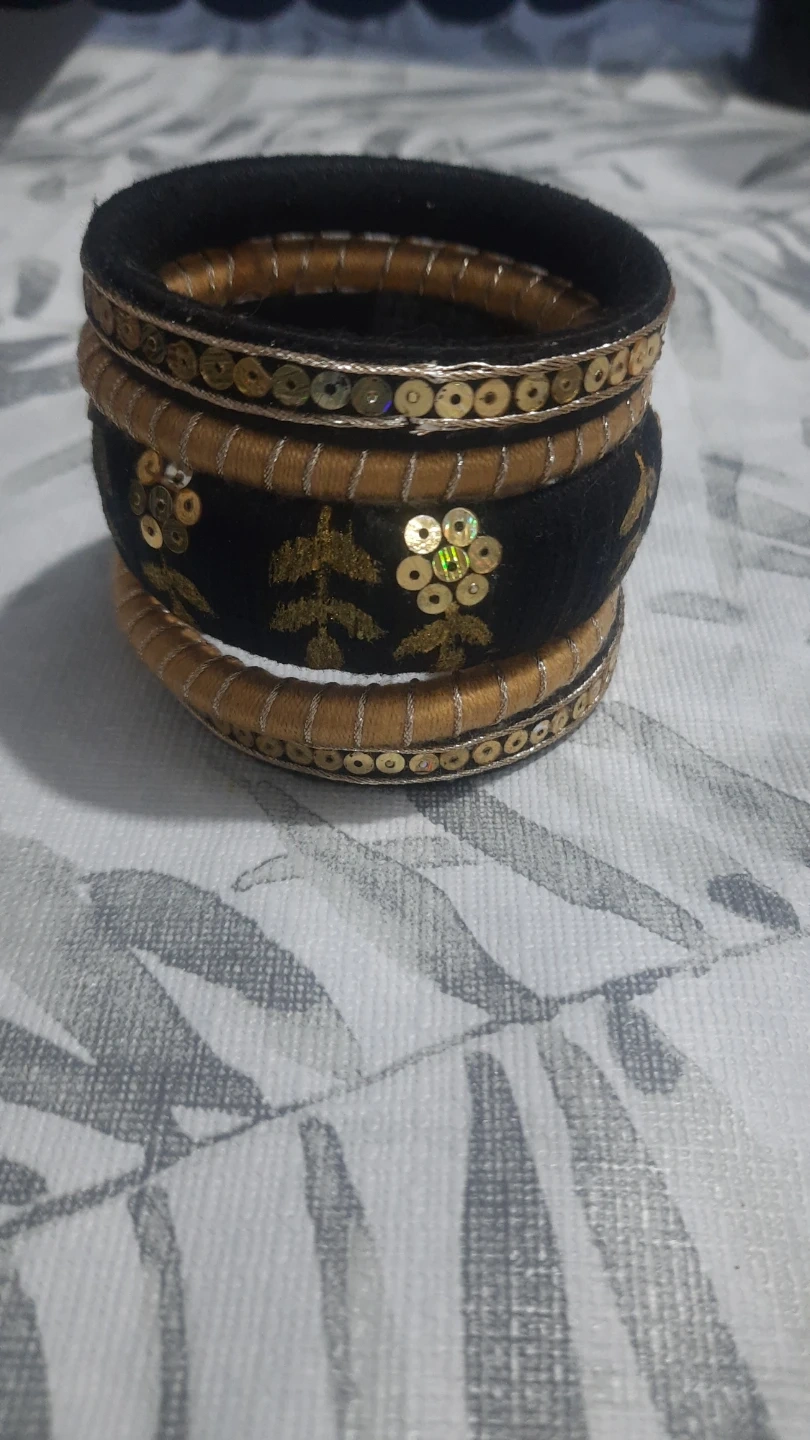 5.7 cm bangles size. Custom made. Each set 20 or all together 80 cad. 1 black and golden set, black thread and golden gillter stone( 5pc), 1 purple sliver thread small glitter stone set( 5pc), 1 set of black thread bangles (10pc), 1 set of silver thread bangles (10pc), 1 set of golden thread bangles(10pc)