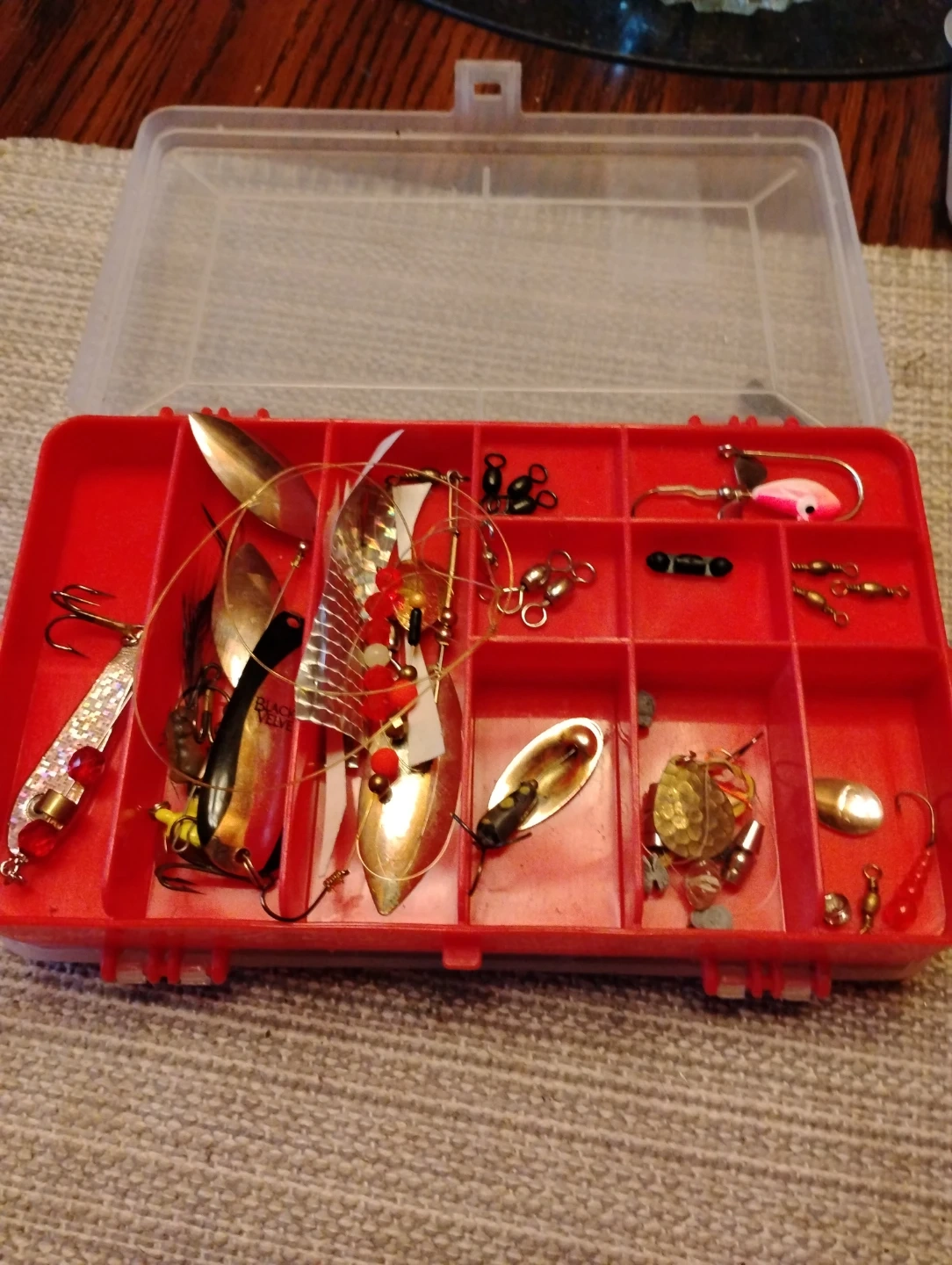 This red tackle box comes with a variety of fishing lures, weights, and floats. It's perfect for organizing your gear for a day on the water. The box contains spoons, spinners, bobbers, and various terminal tackle.
