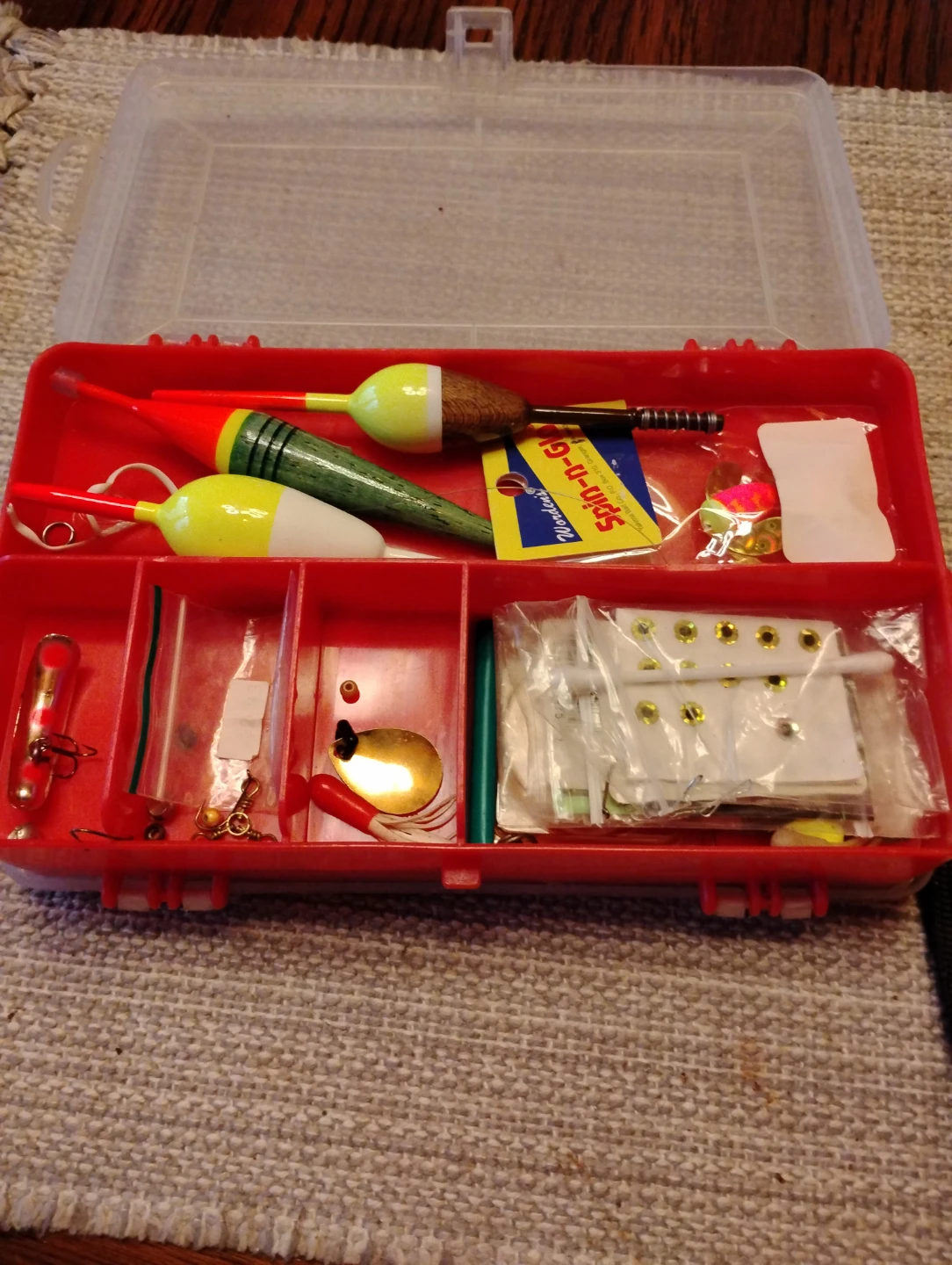 This red tackle box comes with a variety of fishing lures, weights, and floats. It's perfect for organizing your gear for a day on the water. The box contains spoons, spinners, bobbers, and various terminal tackle.
