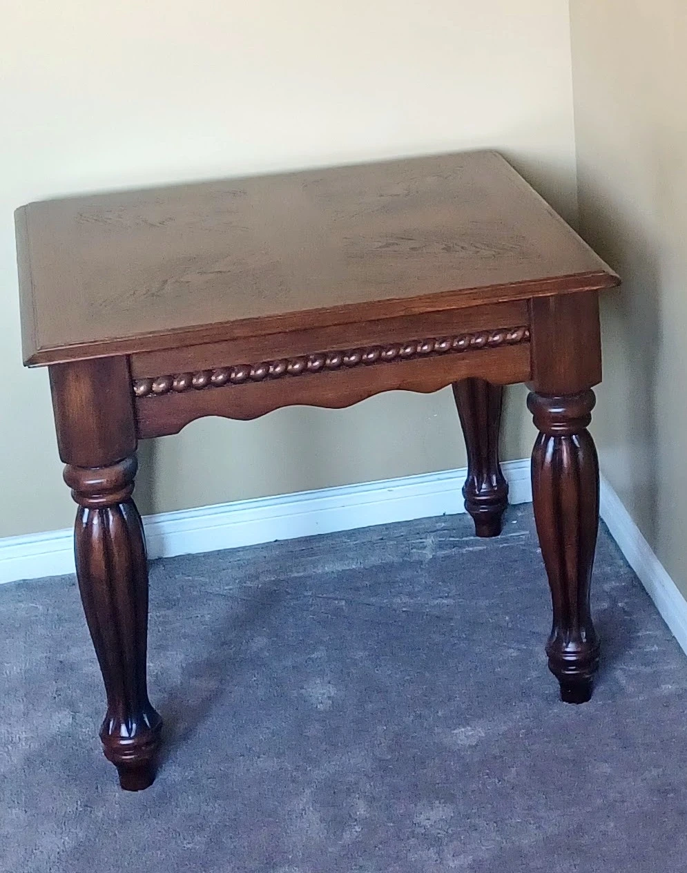 A lovely brown wooden side table, perfect for adding a touch of elegance to any room. It features a classic design with carved details on the legs and edges. It's in great condition and ready to be a stylish addition to your home