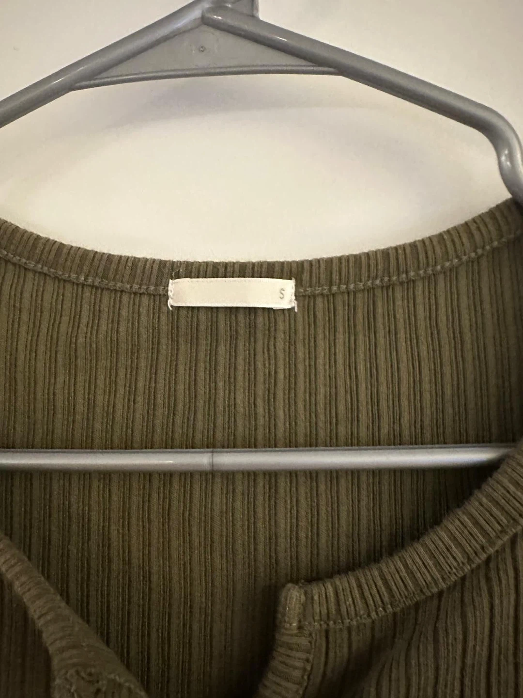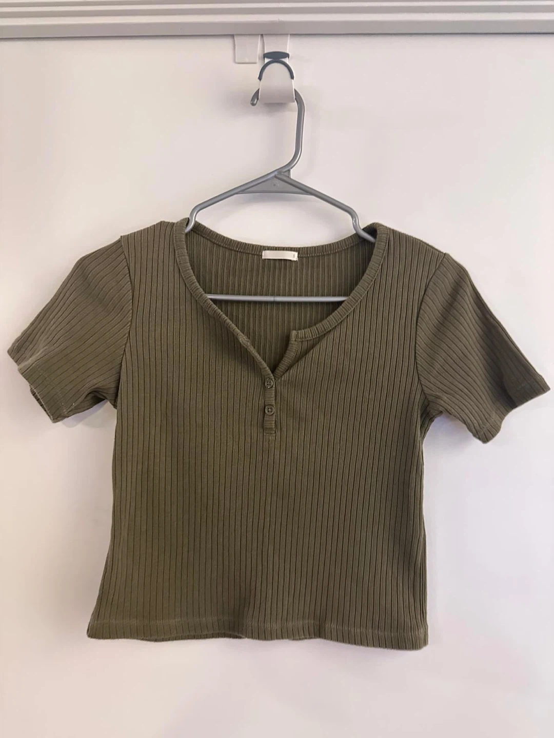 This is a short-sleeve ribbed crop top in an olive green colour. It has a Henley neckline with two buttons and a small cutout. Made of a soft, stretchy material.