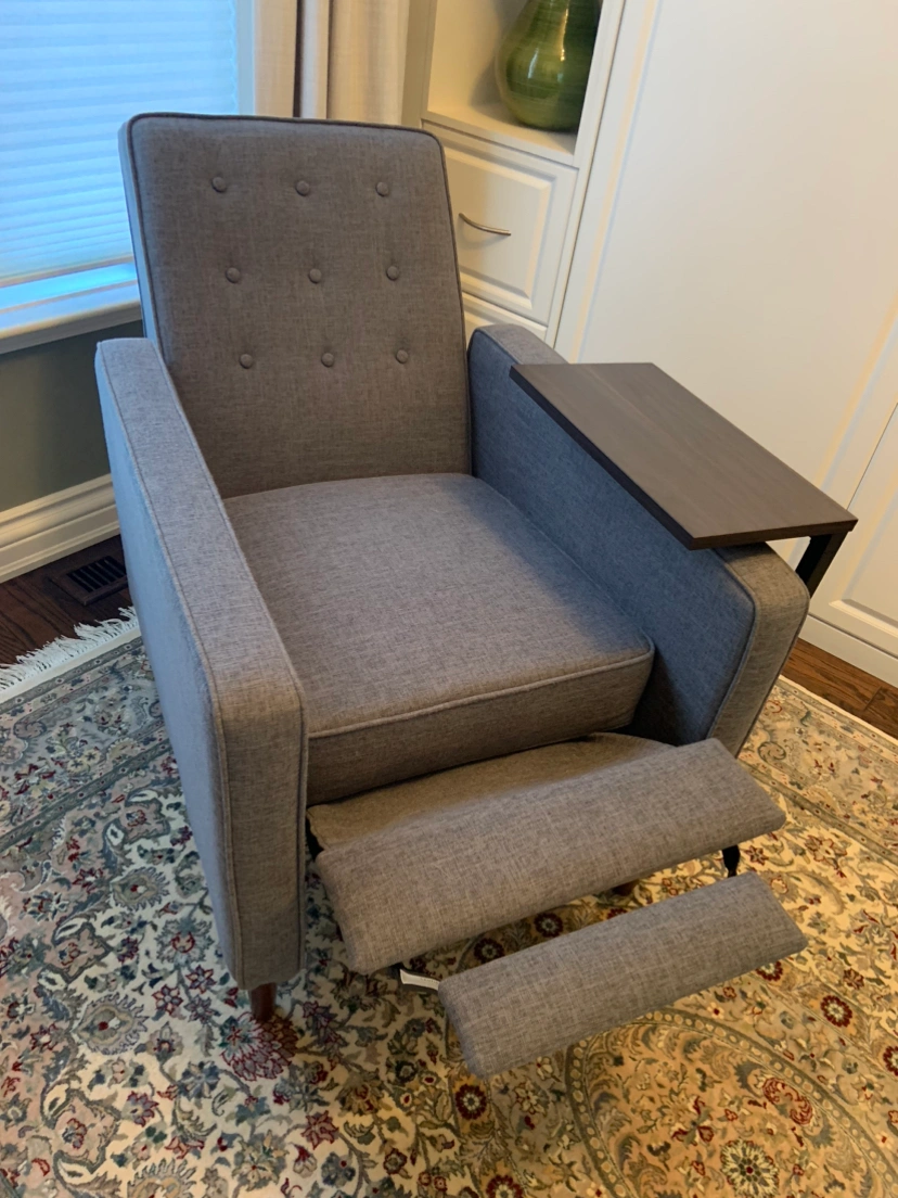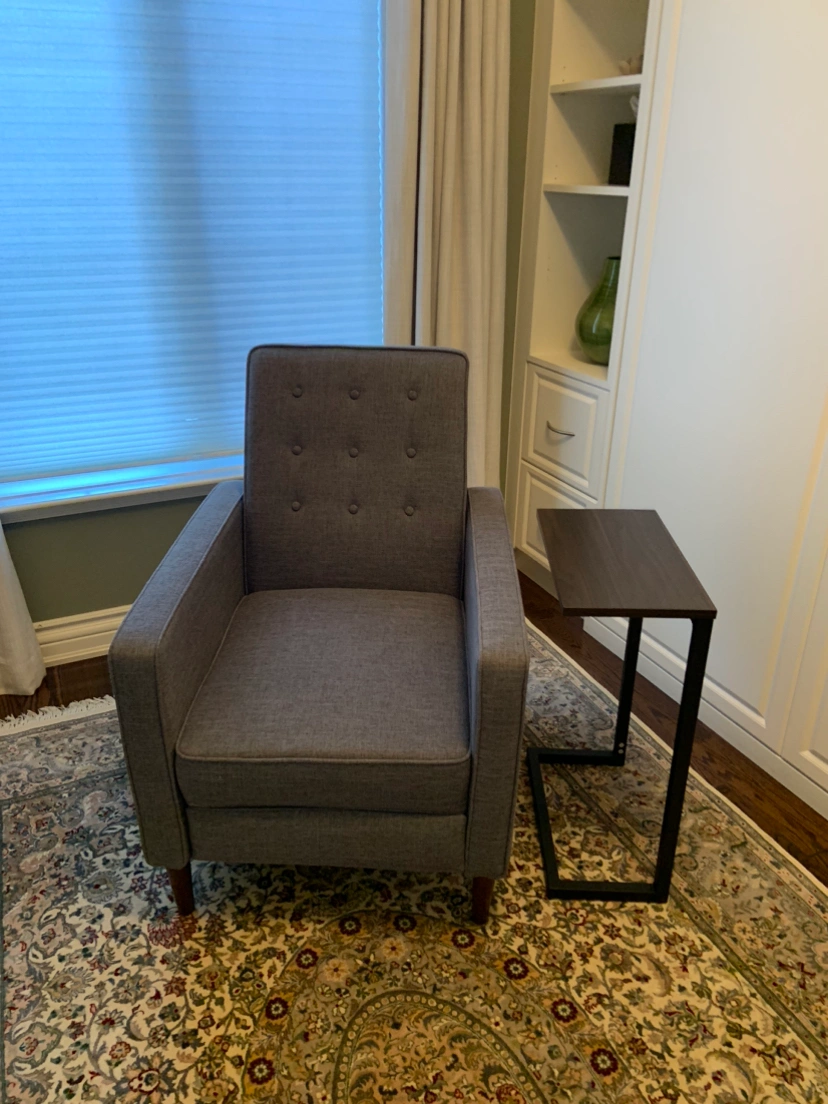Reclining chair. Like new. Includes side table that can slip under the side or front. When reclined, you need about 1 foot behind the chair to recline.